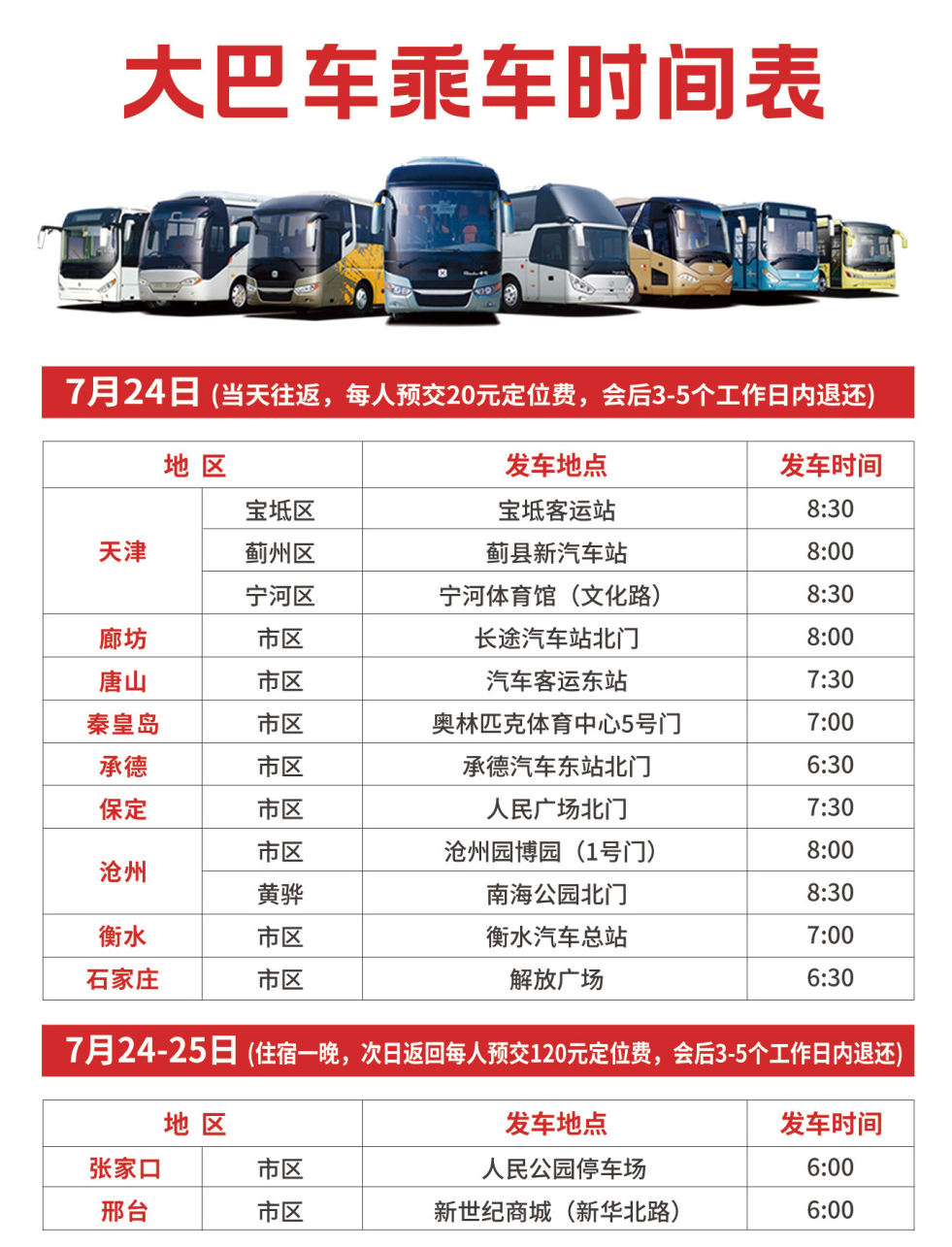 2023天津国际美博会立足天津,辐射京津冀地区,本次大巴车乘坐点设立城市为天津、唐山、廊坊、秦皇岛、承德、保定、沧州、衡水、石家庄、张家口、邢台(其他城市视情况增加,详细乘坐时间及地点见下方内容)。