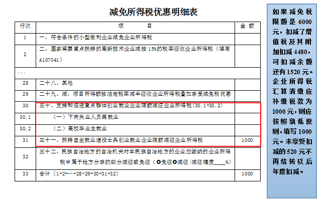 企业招用重点群体和退役士兵减免企业所得税,填写 《A107040减免所得税优惠明细表》第30行和第31行,在对应的“金额”栏内填写减免税额。