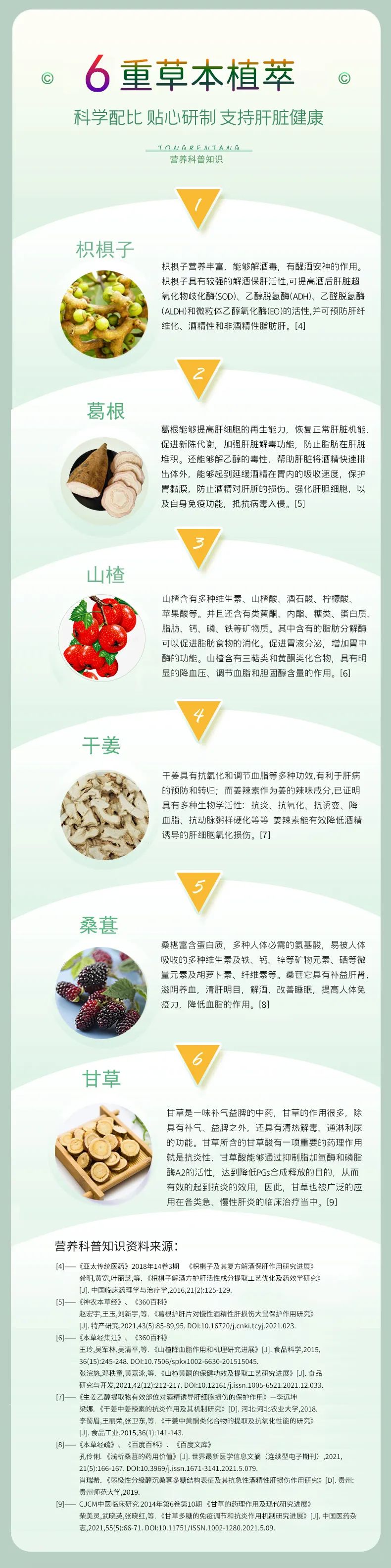 它主要成分是枳椇子、葛根、桑葚、山楂、甘草、干姜等,都是众所周知的保肝养肝药食材,能够激活和增强乙醇脱氢酶和乙醛脱氢酶活性,加快进入体内的乙醇的分解速度,达到解酒、醒酒的效果,同时,所富含肝脏所需营养能够快速直达肝脏,为肝细胞提供营养,提前为肝脏保驾护航。