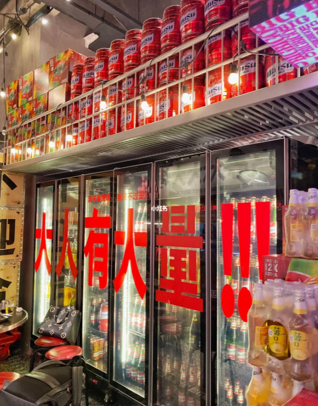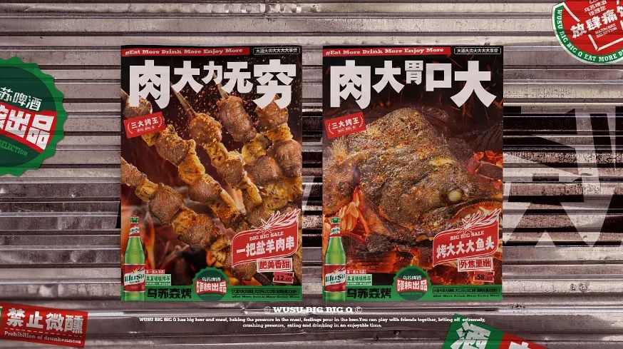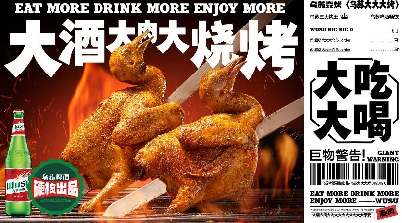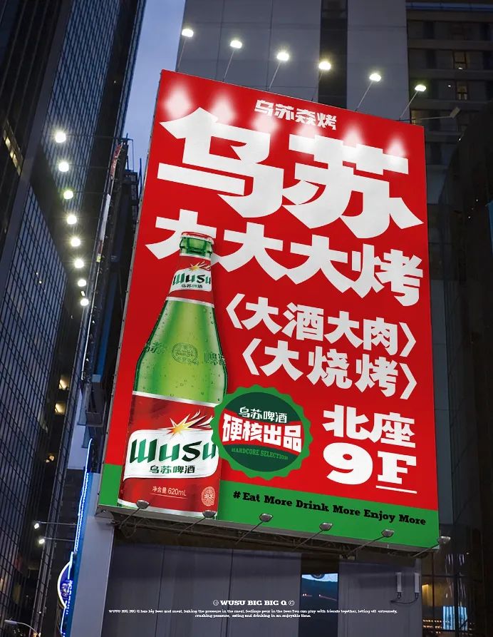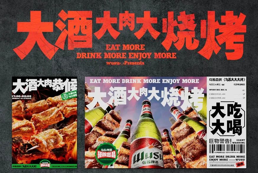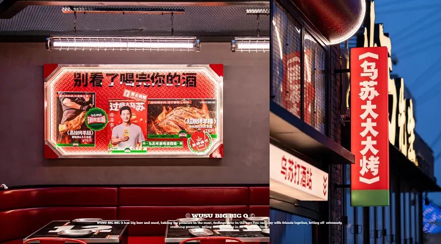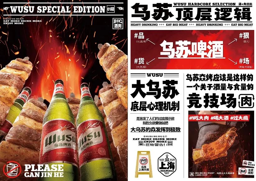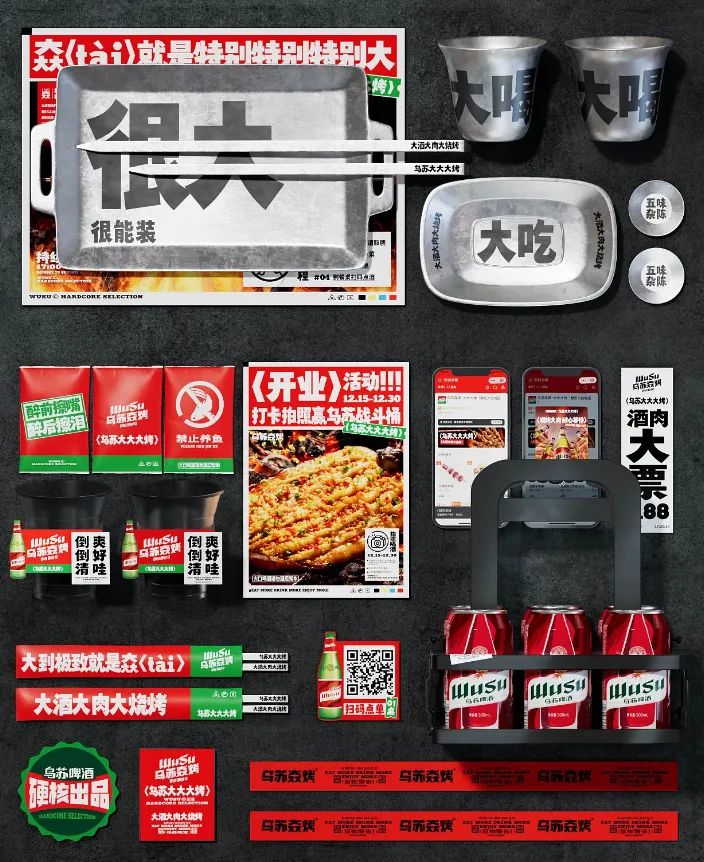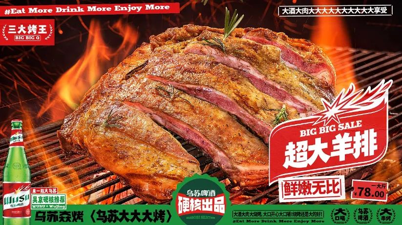 「乌苏?烤」自面世后就引起行业轰动,年入50亿的啤酒老大跨界开餐饮,再次吸引了各类看客的目光。 提炼乌苏啤酒最具辨识度的火花标,通过沉稳厚重的字体、放大,错落有序的字体排版,展示「乌苏大大大烤」的硬核和力量感。