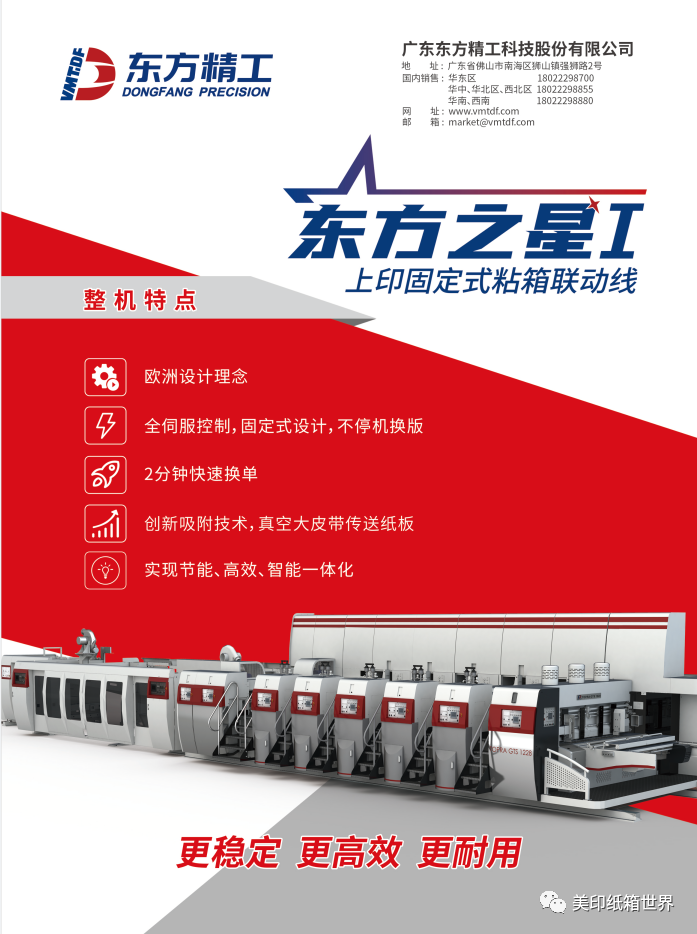 本次展会东方精工印刷机推出了全新设计的“东方之星I 上印固定式粘箱联动线”及“东方之星II 上印开合式粘箱联动线”。可提供多种不同种类规格的瓦楞纸箱印刷包装整线,满足客户多样化需求,为客户创造新的价值。