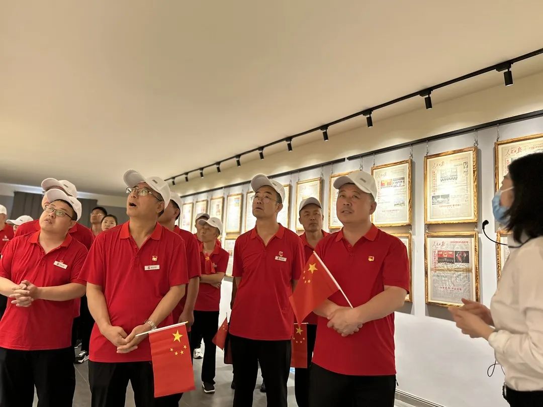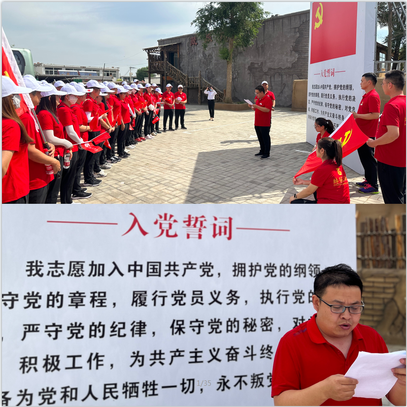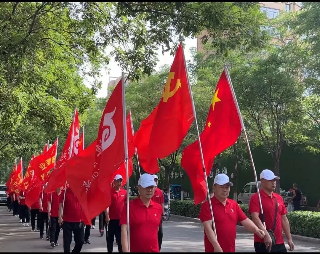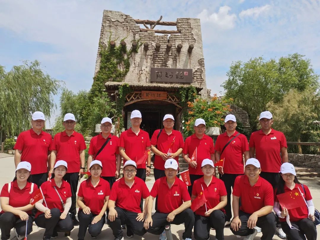 7月1日清晨,六十多名党员包括积极分子、重点培养对象身着统一的服装在公司门前集结,手举鲜红的旗帜,迎着朝阳,绕九原区廉政广场徒步一圈,随即出发前往黄河谣。