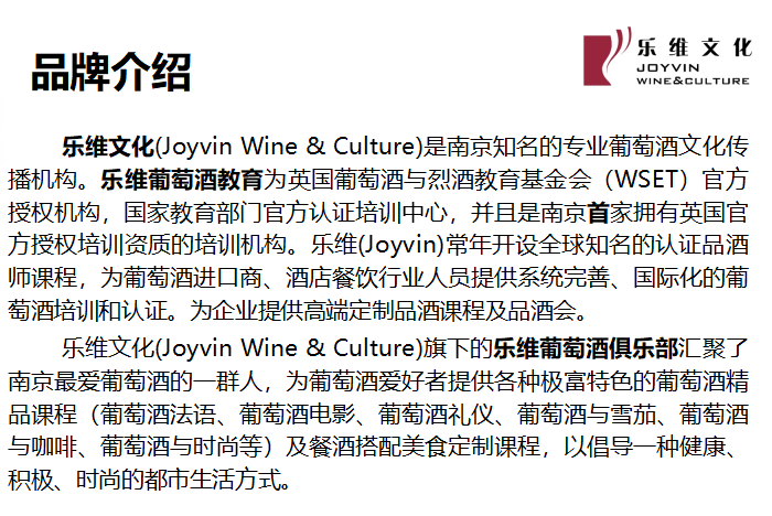 专业的葡萄酒老师会为大家讲解什么是葡萄酒、葡萄酒的几大类型(按颜色、含糖量、形态)、新旧世界葡萄酒、常见的几大葡萄品种、葡萄酒的分级制度等等。