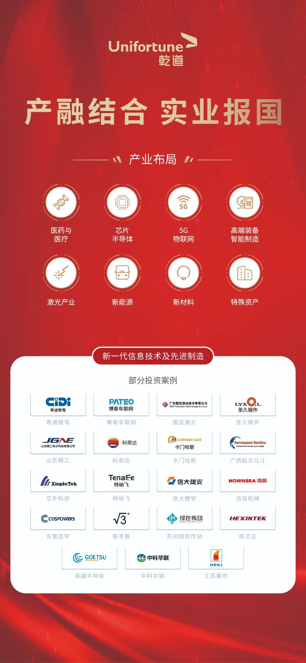 作为在中国经济转型升级背景下发展起来的新一代综合控股集团,乾道集团秉承“产融结合,实业报国”的战略,深度参与中国经济发展和产业升级,致力于成为一家以科技引领创新、服务实体经济的综合控股集团。目前,在战略新兴产业中,乾道已积累了一大批优质项目,特别是聚焦于科技创新、能够带动产业升级、具备显著经济效益的新一代信息技术、高端装备制造、生物医药与医疗科技、新能源新材料等领域的项目。