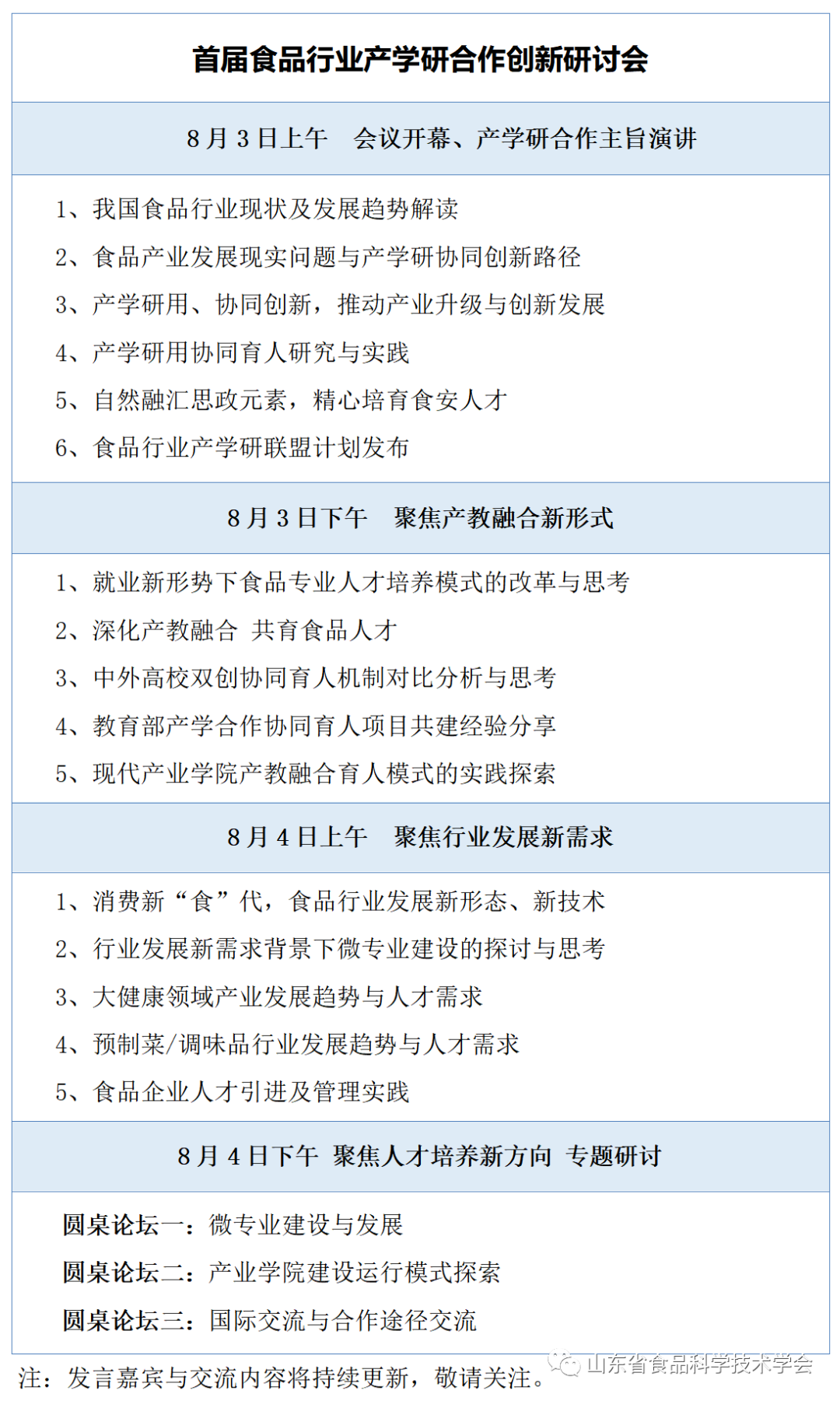 党的二十大报告提出,统筹职业教育、高等教育、继续教育协同创新,推进职普融通、产教融合、科教融汇。为了深化校企合作、产教融合,以食品行业技术发展的最新需求推动食品院校的人才培养,促进食品科技创新和产业转型升级,提升食品行业的竞争力和影响力,山东省食品科学技术学会联合食品伙伴网、安徽省食品行业协会、北京食品学会,拟定于2023年8月3-4日在山东烟台举办“首届食品行业产学研合作创新研讨会”。