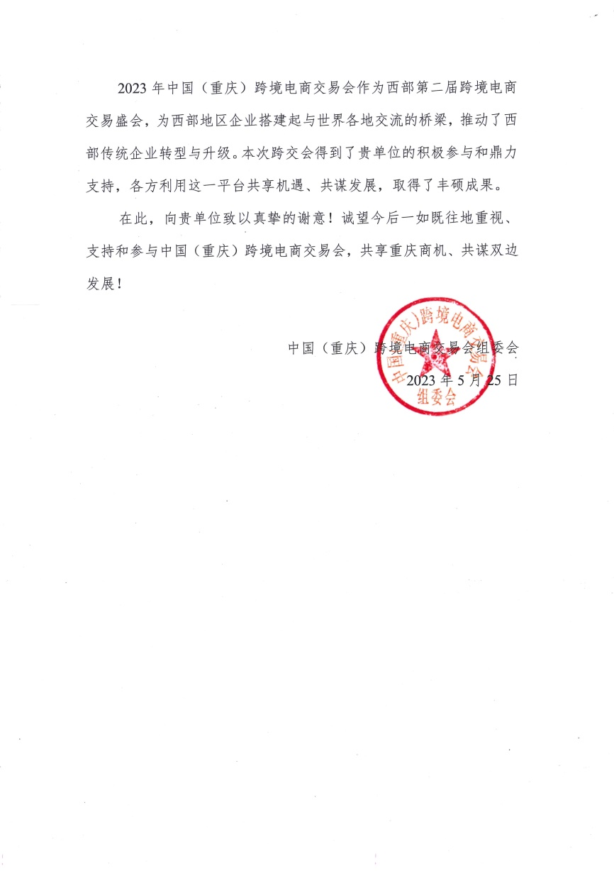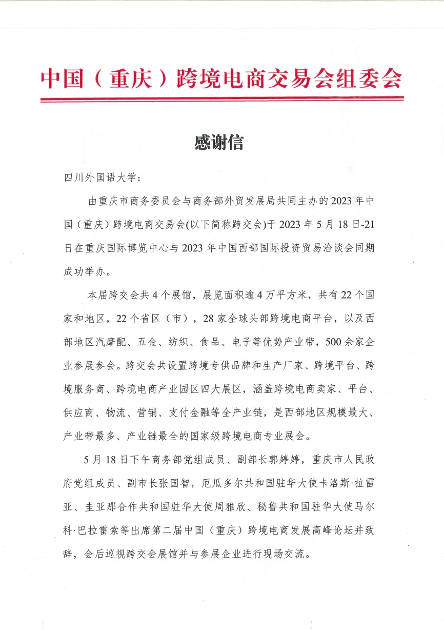 近日,我校收到来自中国(重庆)跨境电商交易会组委会的感谢信,感谢我校国际工商管理学院等相关单位对2023年中国(重庆)跨境电商交易会的积极参与和大力支持。