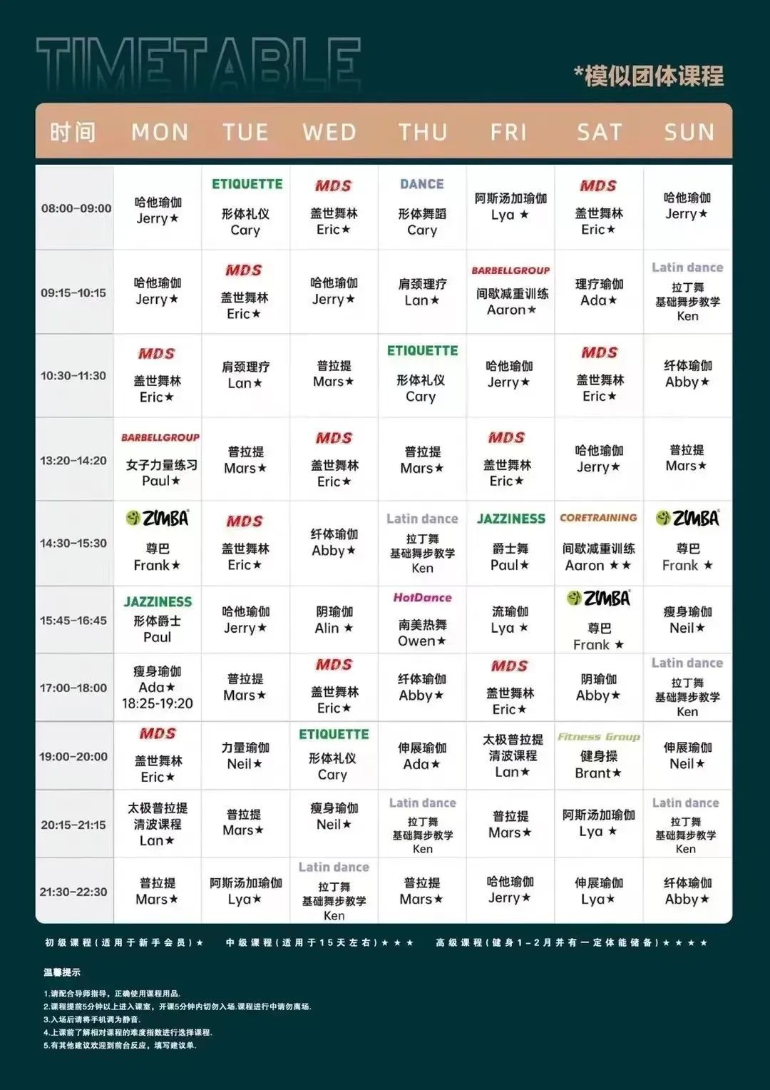拥有瑜伽、舞蹈、普拉提、健身等团体课程,有氧课程与时尚前沿兼顾,例如:搏击燃脂操、塑形杠铃操、高冲有氧、踏板操、拉丁舞、异国舞、炫舞、街舞、爵士、当代舞、现代舞等等,丰富的课程体系,让你拥有多种多样的健身选择,动感热情的、安慢舒缓的……上百种课程任由挑选。
