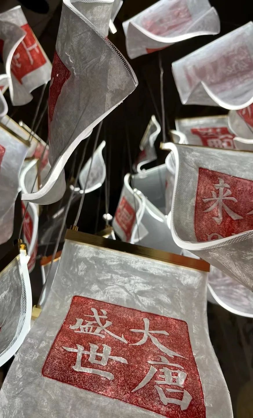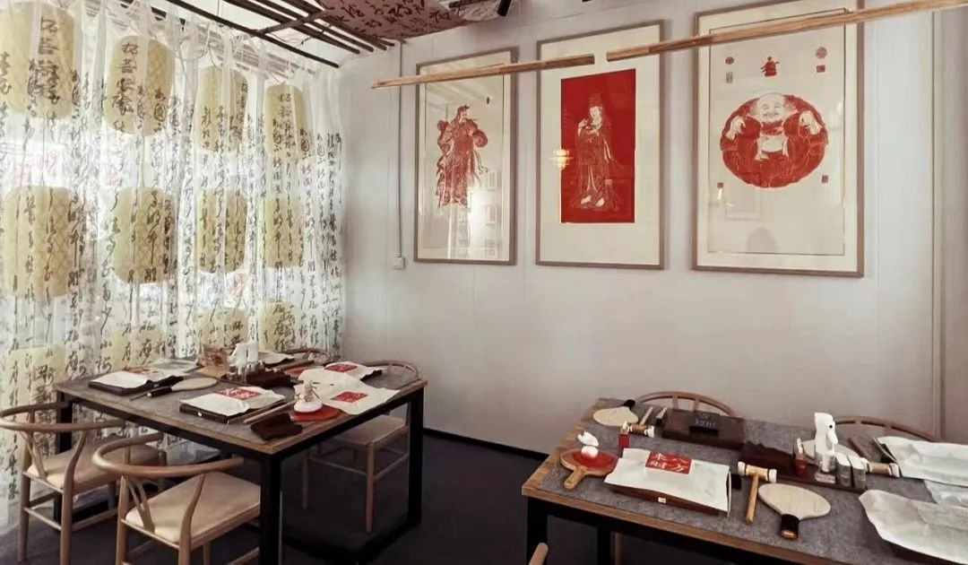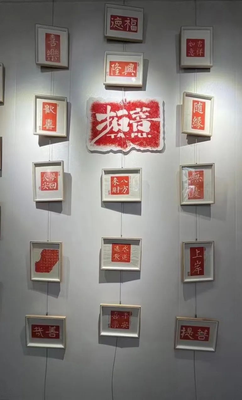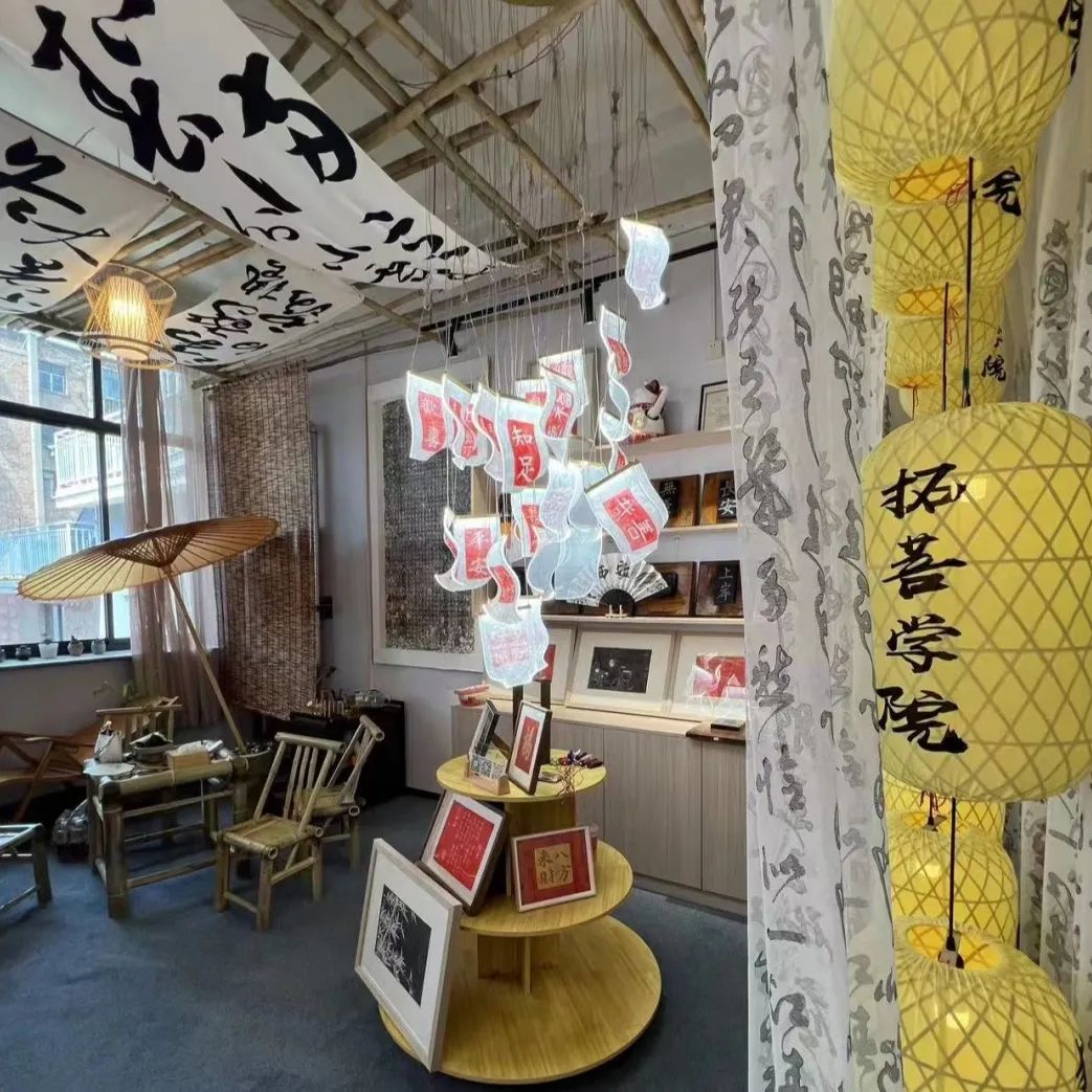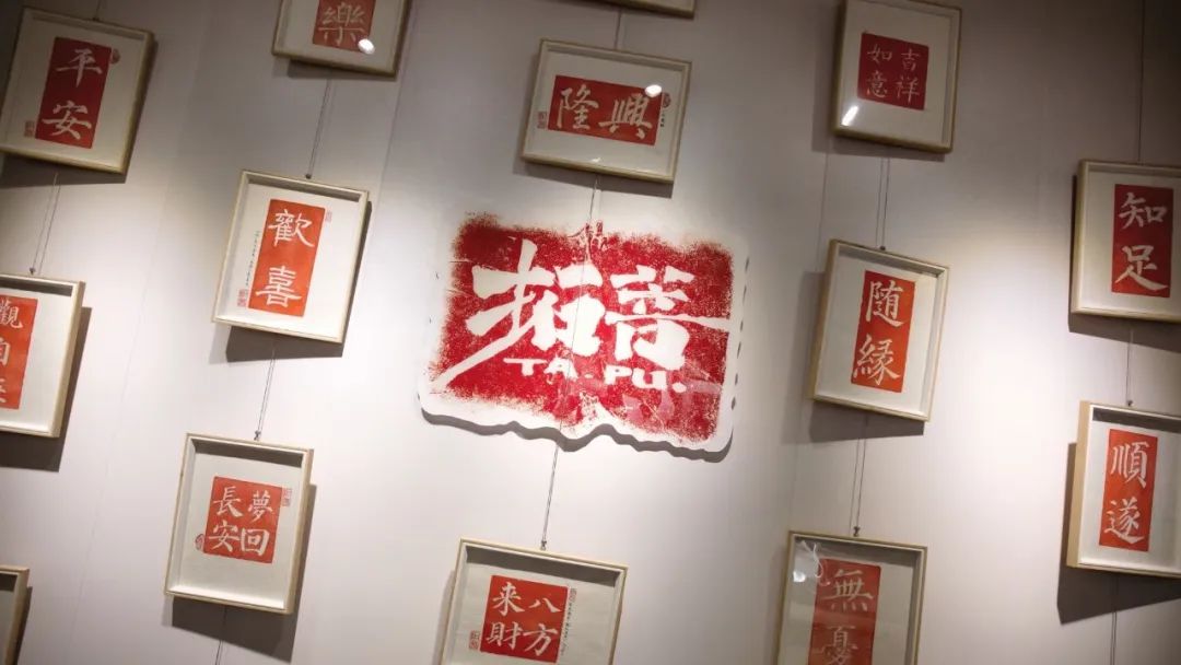 本店宽敞明亮,店内四周都挂有制作完成的拓片展示以及其他国潮元素布置,大小不一,类型各异有着浓厚的文化气息。