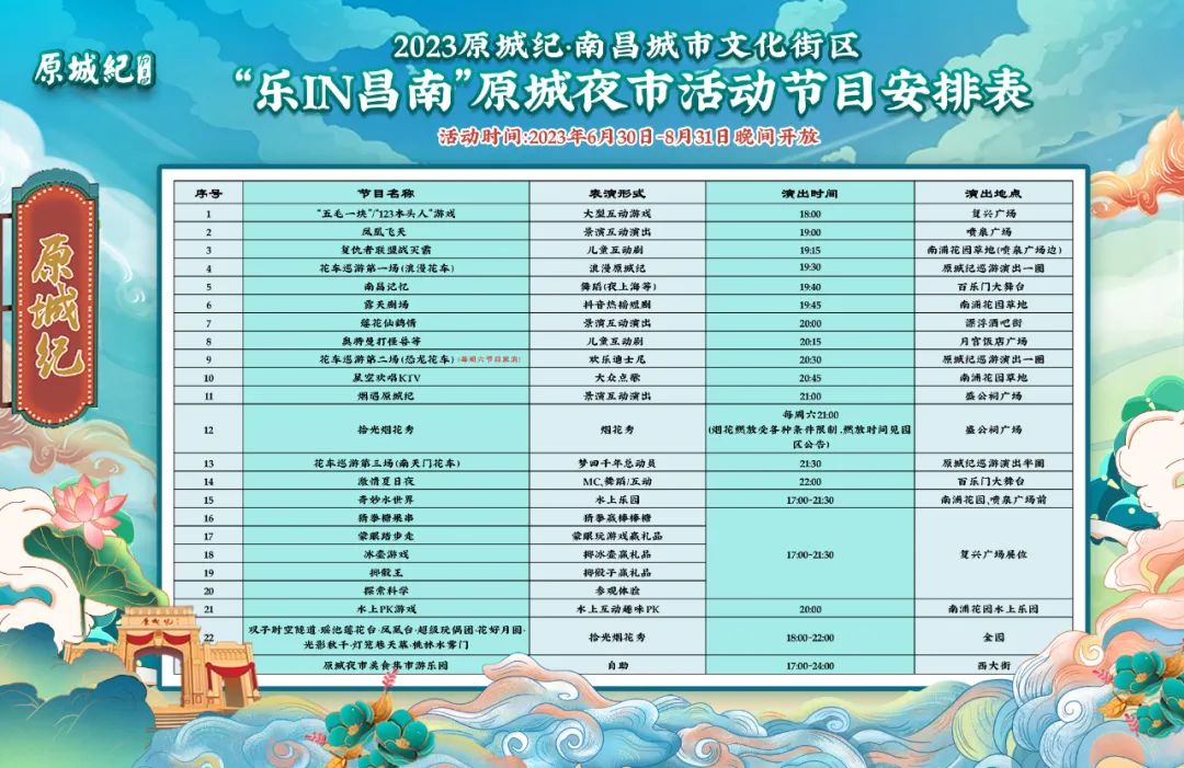 三江后万古村➤罗渡白虎岭➤凤凰沟➤南昌 828 招待所1号楼➤ 昌南文化中心➤原城纪·南昌 “夏日畅饮”2023 年原城纪啤酒节➤原城纪拾光烟花秀➤ 万湖夜市