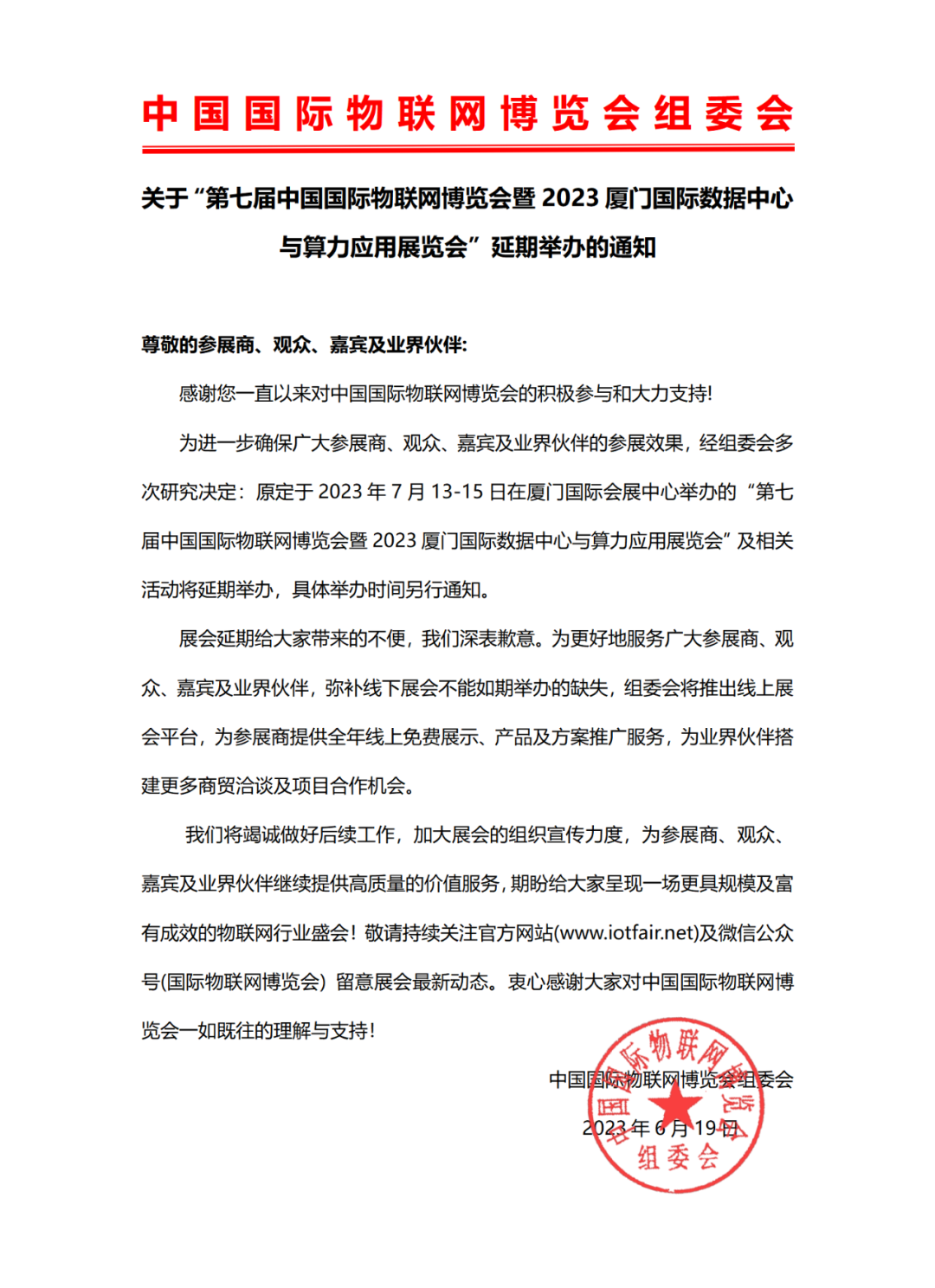 关于“第七届中国国际物联网博览会暨2023厦门国际数据中心与算力应用展览会”更新进展,您可通过官网(www.iotfair.net)、公众号(国际物联网博览会)等渠道了解,感谢您的理解与支持!