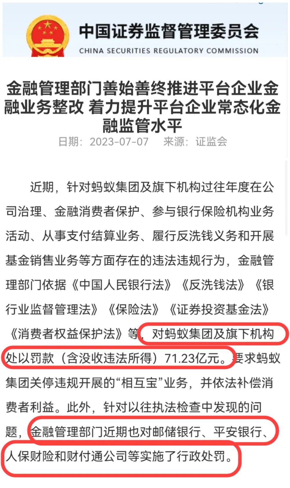 没想到看到,蚂蚁集团被罚71.23亿,这是最近震惊财经圈的比较炸裂的消息了吧!根据证监会网站刚刚公布的消息,蚂蚁集团被罚了71.23亿元。而大家在看这篇小作文的时候,首先得知道这条重磅消息的背景到底是什么。三年前,2020年的11月3号晚上,突发了轰动性的消息,那就是互联网的金融巨头蚂蚁集团上市计划被叫停了,记得吧?此后我们国家对强化反垄断和防止资本无序扩张做出了一系列的部署。一个月之后,也就是21年的12月26号。人民银行援引保监会、证监会、外汇局等等金融管理部门联合约谈了蚂蚁集团。而蚂蚁集团从此就被要求回归支付本源,提升交易透明度,依法持牌,合法合规经营,个人征信业务等五个方面整改。那么现在问题来了,三年过去了,这整改情况到底是怎么样?官方到底是个什么态度呢?首先我们说从2020年11月以来啊,从依法加强监管和有效防范风险的角度来出发,金融管理部门的督促指导蚂蚁集团、腾讯集团等等这些大平台企业全面整改金融活动当中存在的违法违规问题。最官方的说法就是蚂蚁集团以及旗下的机构过往年度在公司治理、金融消费者保护,参与银行保险机构业务活动,从事支付结算业务、履行反洗钱义务和开展基金销售业务等等方面存在违法违规行为。说人话,其实就是蚂蚁在上述领域当中都出现了财险的情况,也应当要接受处罚。随后金融管理部门,根据各项法律法规,对蚂蚁集团以及旗下的机构处于罚款,包括没收违法所得,一共是71.23亿元。要求蚂蚁集团关停违规开展的相互保业务,并且依法补偿消费者的利益。蚂蚁2022年利润差不多是312亿,也就是说这差不多一个季度利润就交了罚款。另外央行还对支付宝开出了大罚单。行政处罚信息显示说这支付宝珀湖中国网络技术有限公司、蚂蚁科技集团等等四家企业合计罚款超过32.87亿元。那现在包括蚂蚁在内的这些平台企业整改处于什么阶段呢?官方的表述是目前平台企业金融业务存在的大部分突出问题,已完成整改。金融管理部门工作重点从推动平台企业金融业务的集中整改转入常态化监管。注意,集中整改转入常态化监管。这句话是重点中的重点。那么这次罚款官方对互联网平台经济持怎样的管理态度?