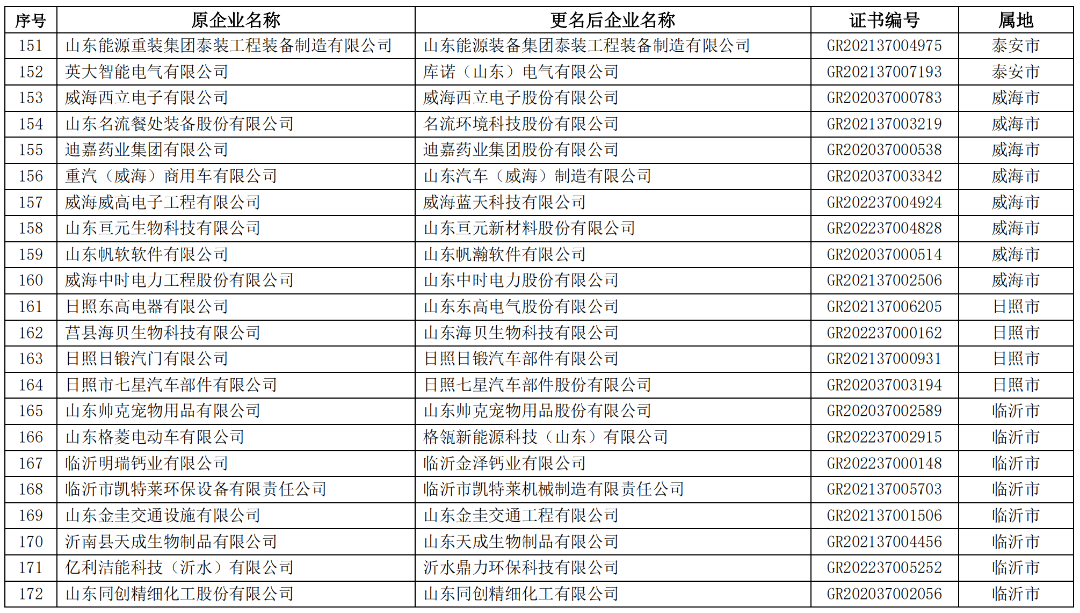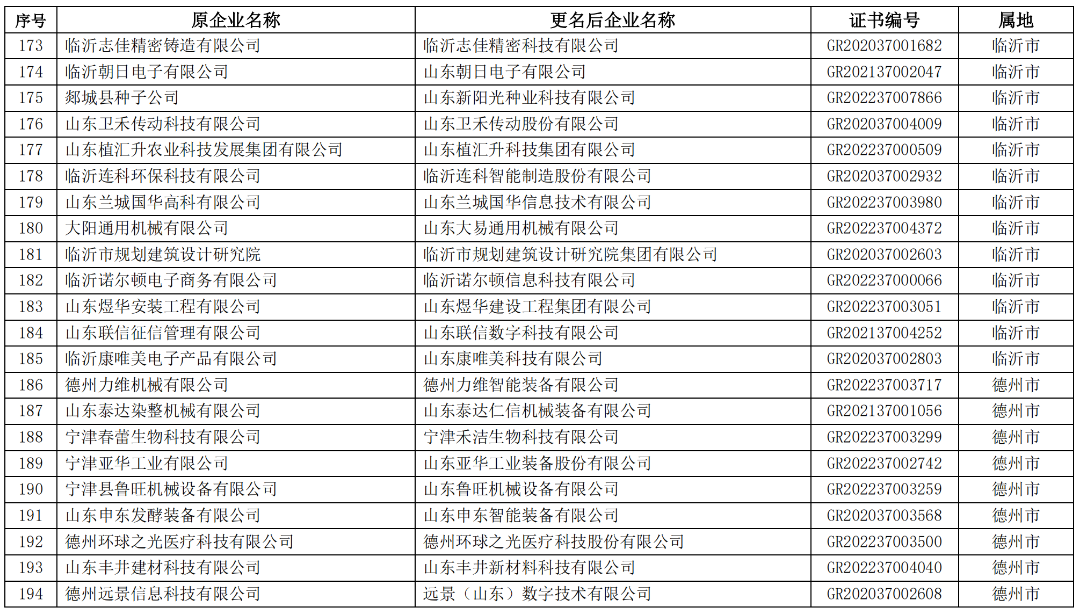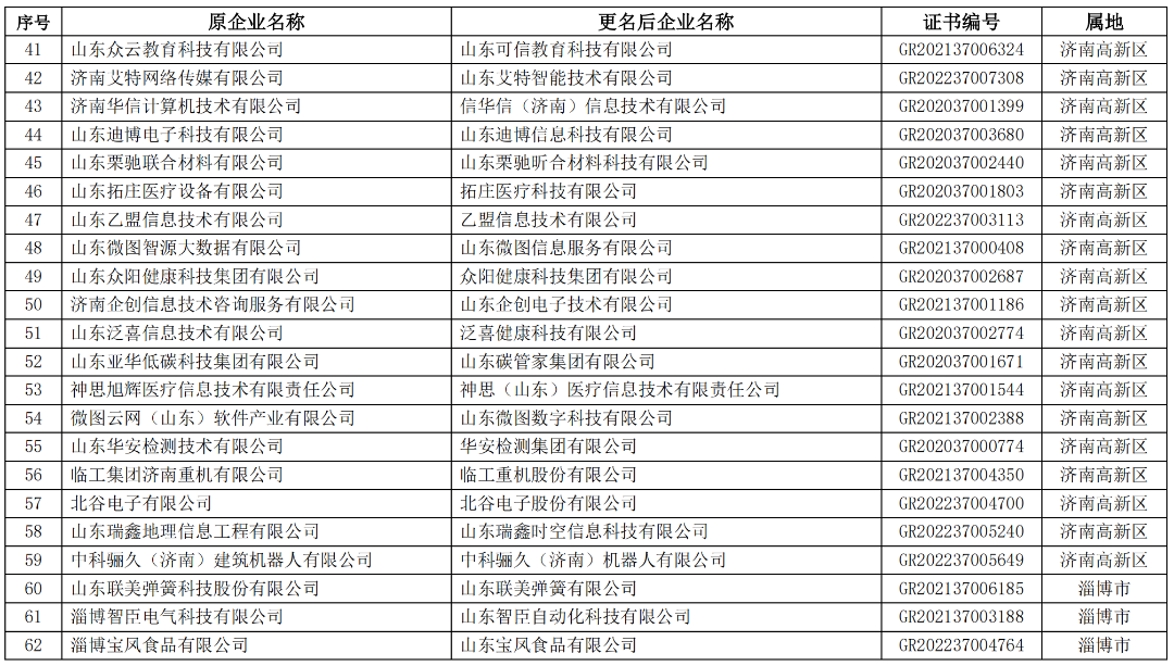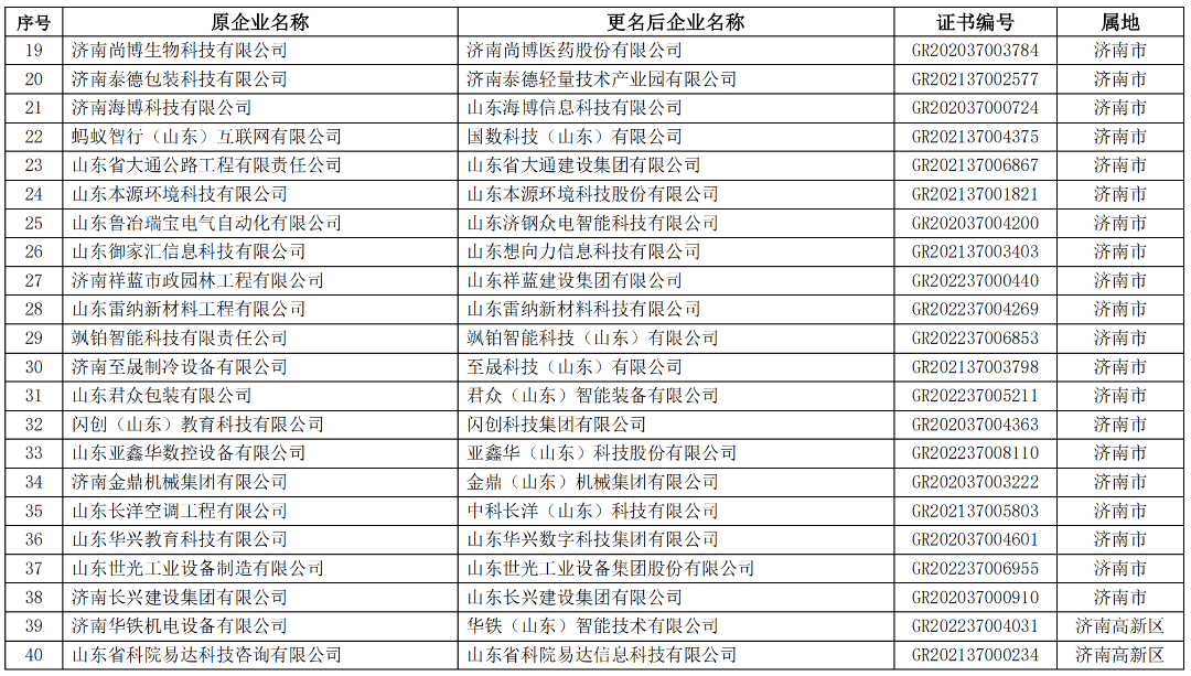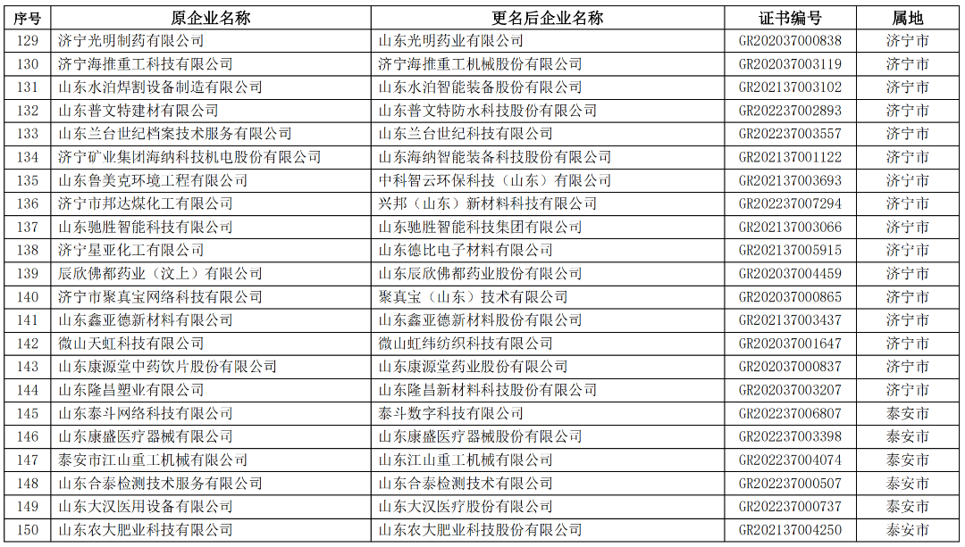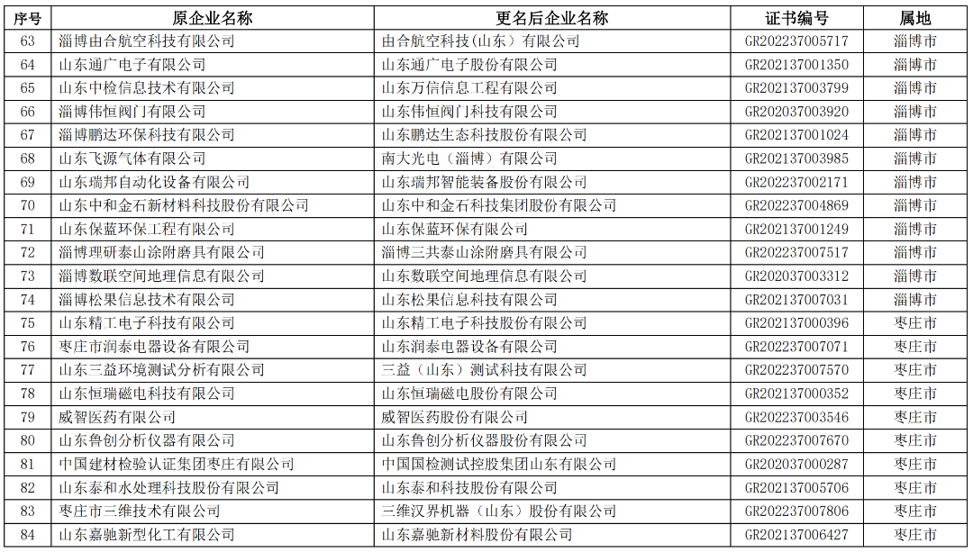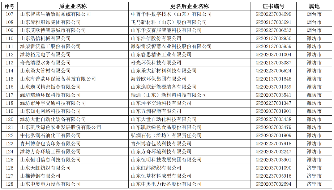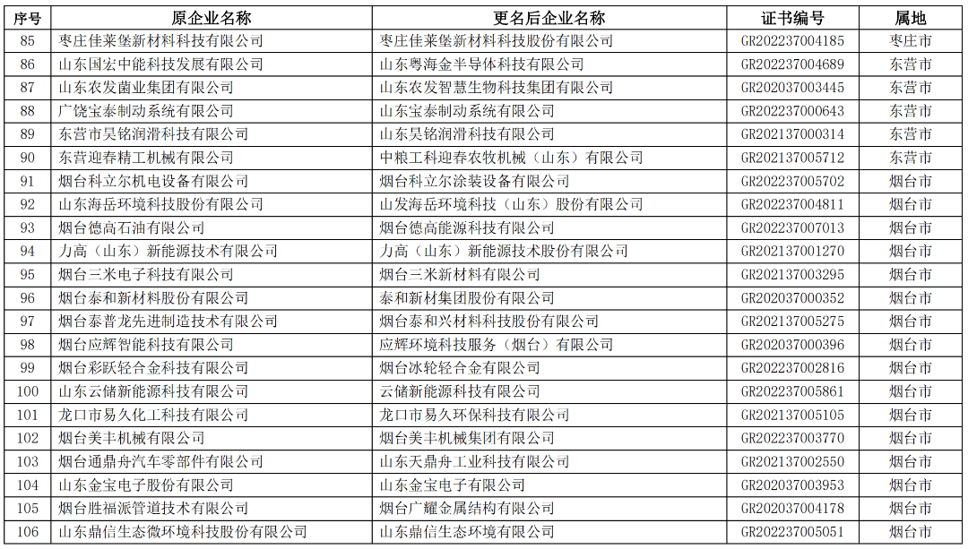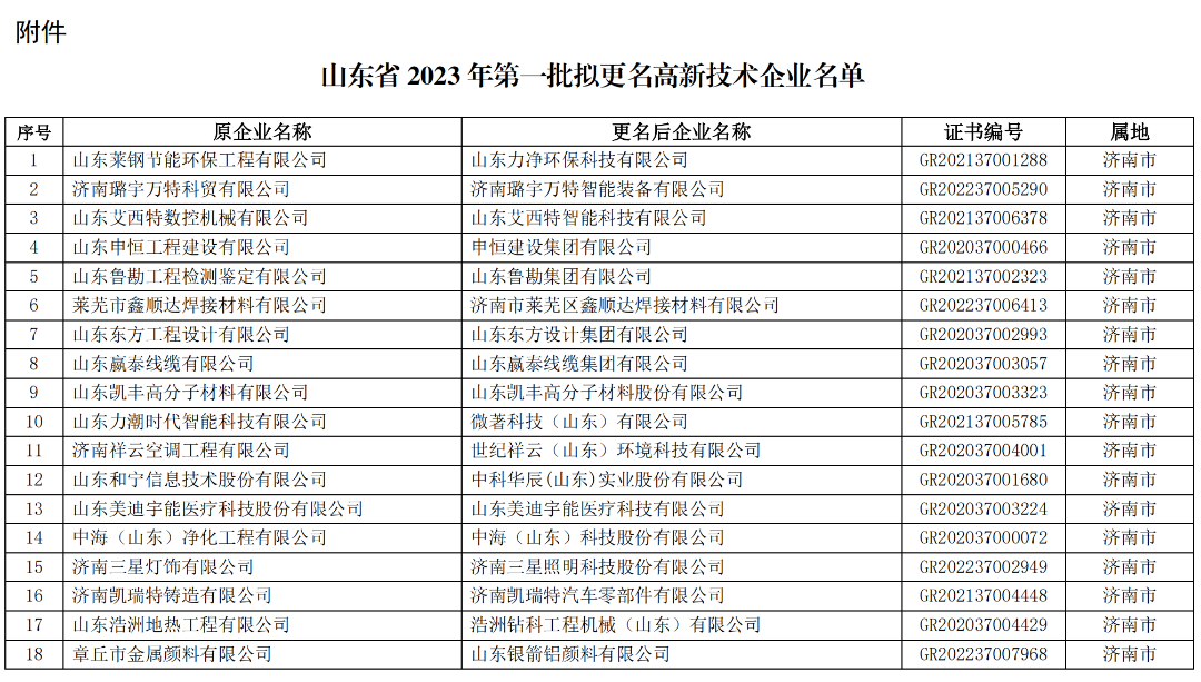 山东省2023年第一批拟更名高新技术企业名单