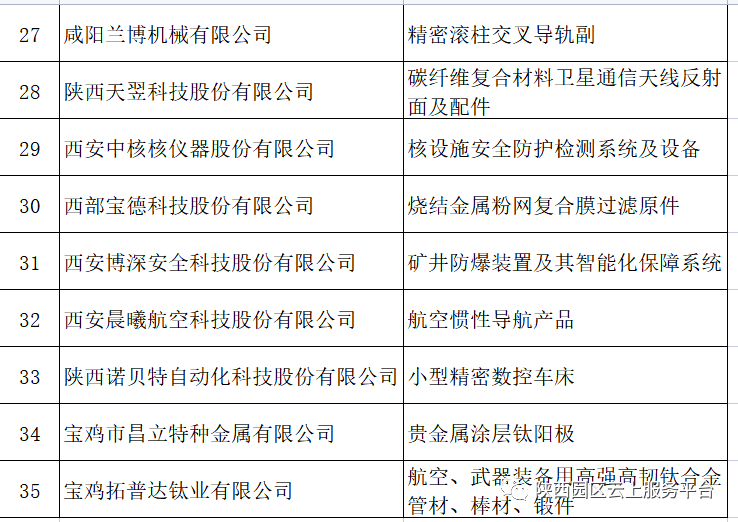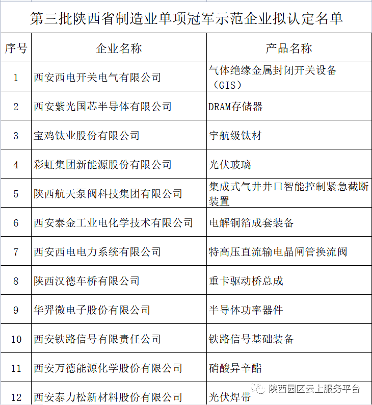 按照省工信厅等六部门《关于加快培育发展制造业优质企业的实施方案》和《陕西省制造业单项冠军培育认定管理办法》,经地方申报推荐、专家评审、现场考核、网站公示等程序,最终确定了西安西电开关电气有限公司、西安紫光国芯半导体有限公司、宝鸡钛业股份有限公司等35家企业为第三批省级制造业单项冠军示范企业。此次评定的省级制造业单项冠军示范企业,都是当前制造业高端领域的领军企业,在行业内拥有领先同行的技术实力。