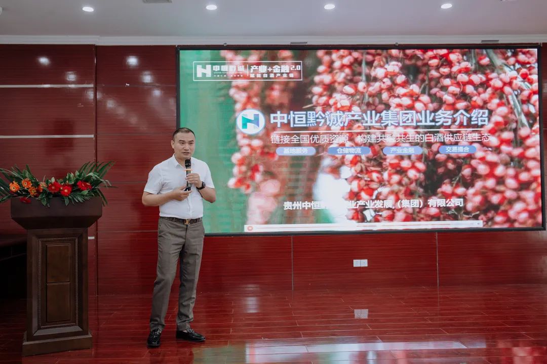 贵州省中恒黔诚农业产业发展(集团)有限公司 董事长孙祎鑫,向与会单位介绍了中恒黔诚产业集团的“产业+金融”2.0 业务范围;中恒黔诚自2019年涉足供应链金融,成为企业与金融机构的桥梁,服务好酒企上下游企业,链接金融,资源共享,解决企业在基地建设,种植过程,仓储管理,贸易中的发展难题,整合产业链中最优价值链,搭建白酒原料产业共享共赢平台。2023年,中恒黔诚聚集了省内4.2万亩,省外50万亩的基地资源,供协会的会员单位认领;中恒黔诚全程提供全链条的资金服务、仓储服务、物流服务,数据服务,去化库存服务。助力酒企供应商交货无忧。