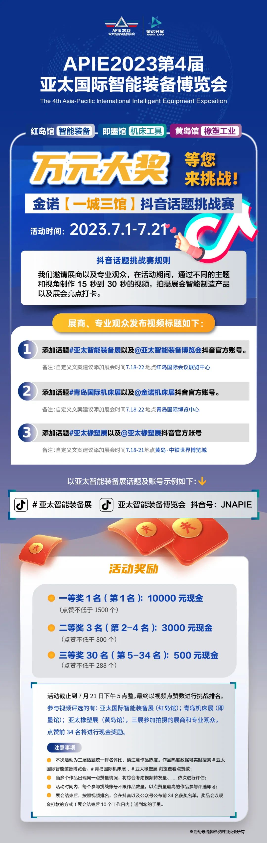 其中红岛馆全集中展示工业自动化、工业互联网、工业机器人、智慧物流装备、电源工业等板块系列产品及技术等版块,即墨馆包括金属切削/数控机床、激光加工/金属成型、精密机床/特种加工设备、锻压冲压、激光板金/机器人/检测测量/工业控制、智能工厂、智能制造/高端装备、刀具/磨具/功能部件/模具/工具等版块,黄岛馆涵盖塑料机械和橡胶机械及材料版块,数万台/套产品、设备及解决方案集中亮相亚太国际智能装备博览会,打造智能制造行业视觉盛宴!