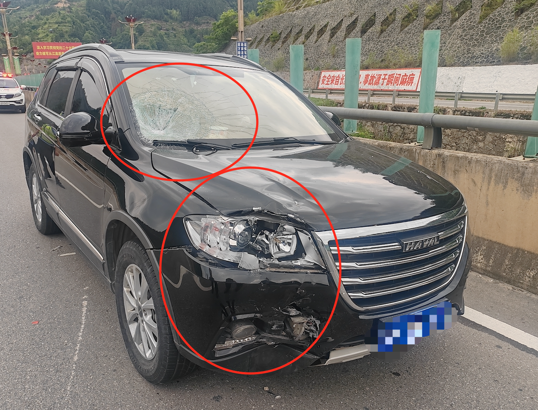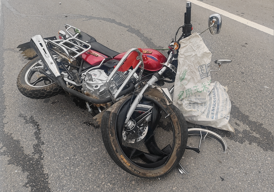 在事故现场民警看见,黑色小轿车右前方的挡风玻璃部分碎裂,上面还带有摩托车驾驶人头部撞击的血迹,车辆右前方保险杠和大灯受损。而摩托车在本次事故车前轮损坏,驾驶人受伤。