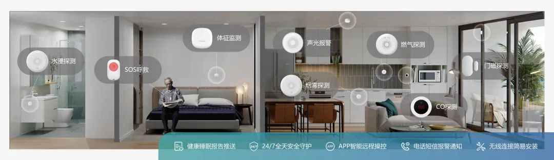安如氏®养老监护套装由康居智能体征监测仪、门磁、气感、烟感、水浸、SOS呼救、CO探测和声光警号等组成,形成一套完善的中老年人居家养老健康监护方案。通过毫米波雷达生物探测和识别算法,以及领先的ZigBee低功耗无线传输传感器,在云端实现多传感器融合数据处理,实现对独居中老年人群体的生活健康状态全方位监护。同时通过多类型传感器探测和云报警,可以实现中老年人居家养老安全监护。