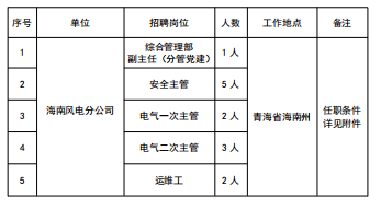 国家电投集团黄河公司海南风电分公司(以下简称“海南风电分公司”)成立于2022年6月,注册地在青海省海南州共和县恰卜恰镇,海南风电分公司依托海南州两个千万千瓦级新能源电源基地资源和智能化区域集控运营优势,按市场化方式运作,对外承接风电场管理、运维、检修、运行、技术监督、设备检测等业务,主要负责黄河公司海南地区风电项目的生产运营工作。现根据工作需要,面向社会公开招聘空缺岗位人员,具体事项如下: