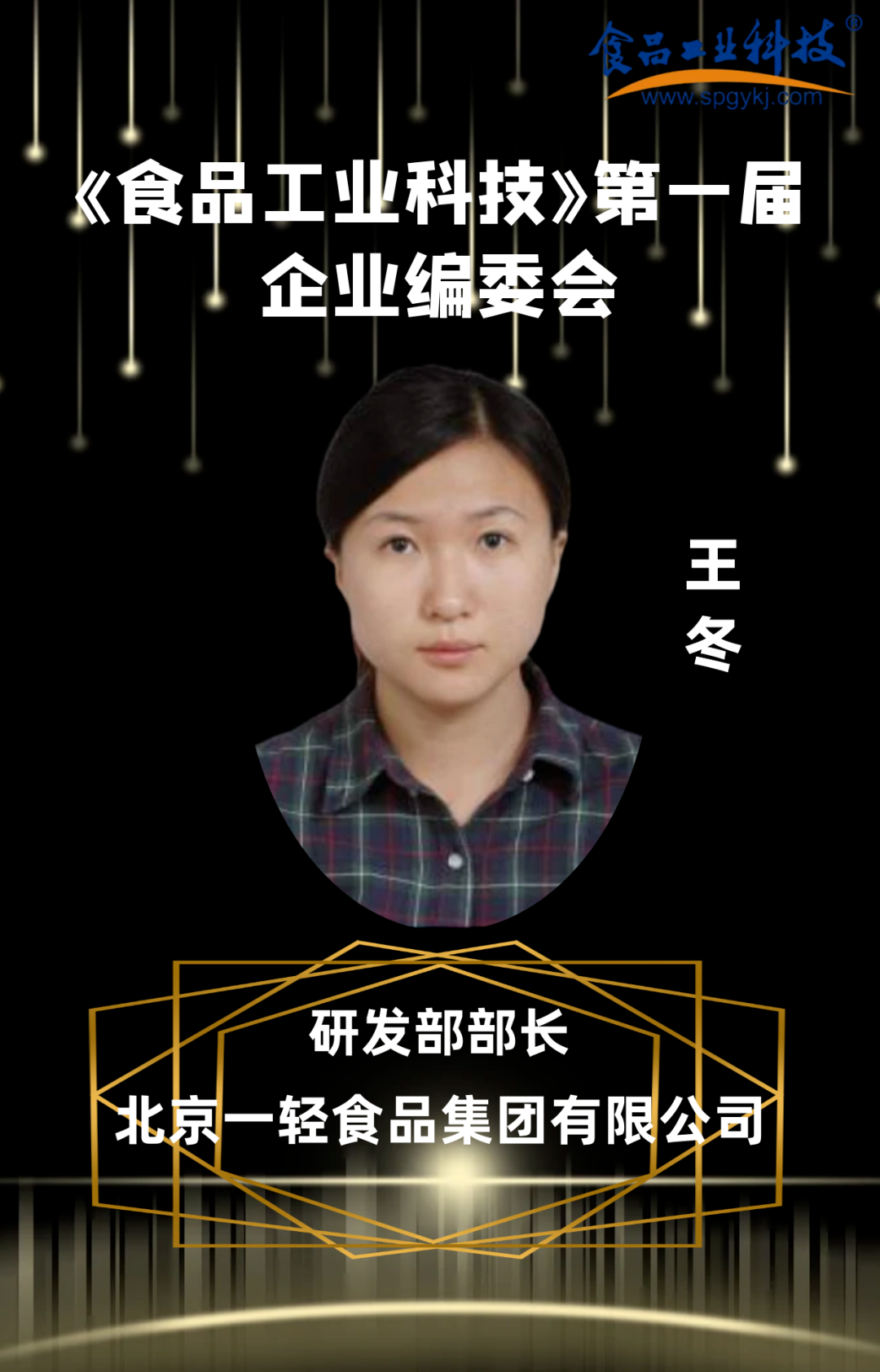 王冬,博士研究生,高级工程师,毕业于中国农业大学食品科学与营养工程学院,目前担任北京一轻食品集团有限公司研发部部长,历任市场部部长和消费者研究中心负责人,兼任北京工商大学行业导师,中国焙烤食品糖制品协会技术法规委员会委员,致力于柑桔加工和综合利用研究,拥有多项食品饮料爆品打造成功经验,在国外学术期刊上以第一作者发表SCI高水平论文六篇,参与编写教材一部。