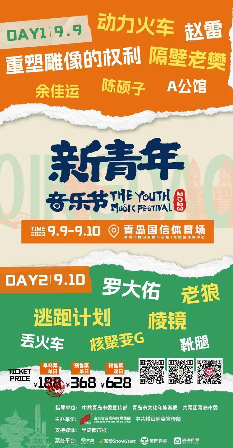 其中,9月9日至10日新青年音乐节备受瞩目,罗大佑、赵雷、老狼、逃跑计划、动力火车、隔壁老樊、核聚变G、棱镜、丢火车……十四支乐队将来到青岛“新青年”音乐节现场,撩动你的耳朵。乐迷的激情将被炎炎夏日点燃,青春的活力将在青岛绽放。