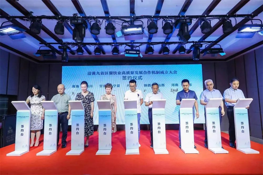 2023首届黄河流域(聊城)美食文化节期间,为促进黄河流域餐饮经济高质量发展,加强合作共识,倡导餐饮行业绿色低碳转型升级,7月7日上午,沿黄九省区餐饮业高质量发展合作机制成立大会在聊城召开。将围绕乡村振兴、食材互通、烹饪互学、人才互助、企业互动、文化互鉴、经济互联等内容,不断寻求创新突破和深度融合,搭建沿黄九省区餐饮业多方面沟通、合作的平台,打通县域经济领域,实现九省区行业协会携手同心,共谋发展的新局面。