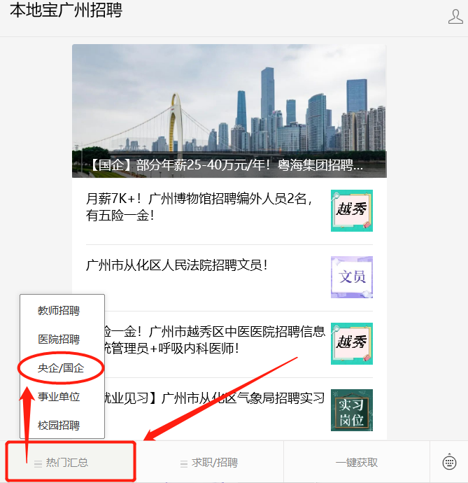2.点击菜单栏【 热门汇总-央企/国企 】可查看更多岗位招聘信息!