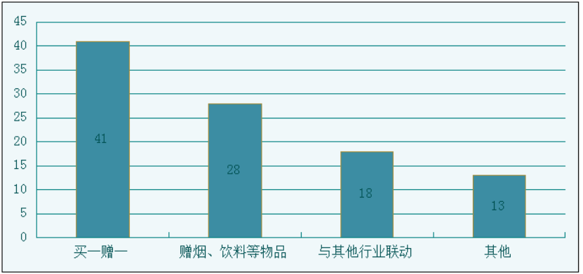 还有18%的经销商选择和其它行业来合作,例如影楼、婚庆公司等,只要消费者选择了他们的产品,经销商会为消费者在婚纱照和结婚仪式上的花费付一定的费用,这种作法也颇受消费者欢迎。