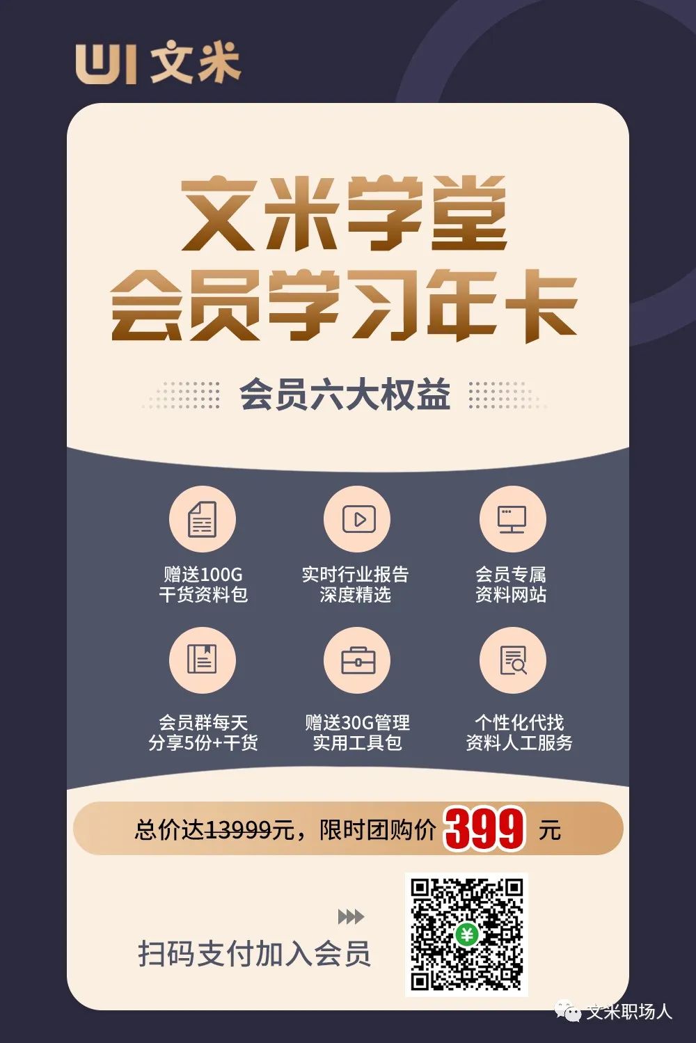 文米学堂,专注服务于职场人的知识平台,让每位职场人打造个人专业领域知识体系。致力于为职场精英和企业管理者,专注提供有价值的各岗位各层级的职场资料和行业分析报告。为您个人成长赋能、提升工作效率赋能。