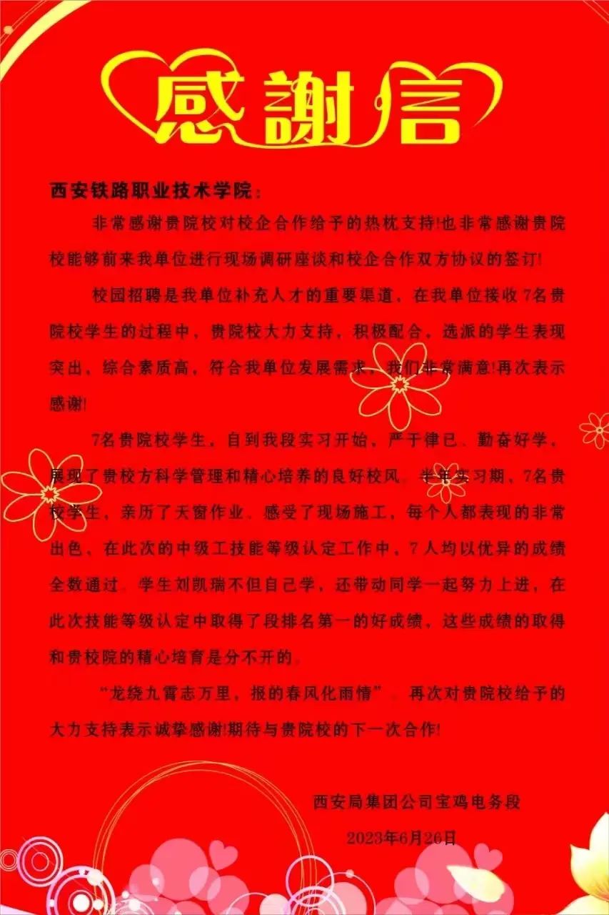 一封感谢信、一面锦旗不仅仅是对学生实习期间工作的肯定,更是代表着企业对于长期以来校企合作成果的高度认可。接下来,学院将继续把毕业生就业实习工作作为落实立德树人关键环节,实施全链条、全方位、全身心投入工作机制,深耕细作育人沃土,积极搭建就业平台,不断深化校企合作,紧密对接轨道单位用人需求,大力发掘优质资源,提升人才培养质量,为陕西经济发展贡献力量。