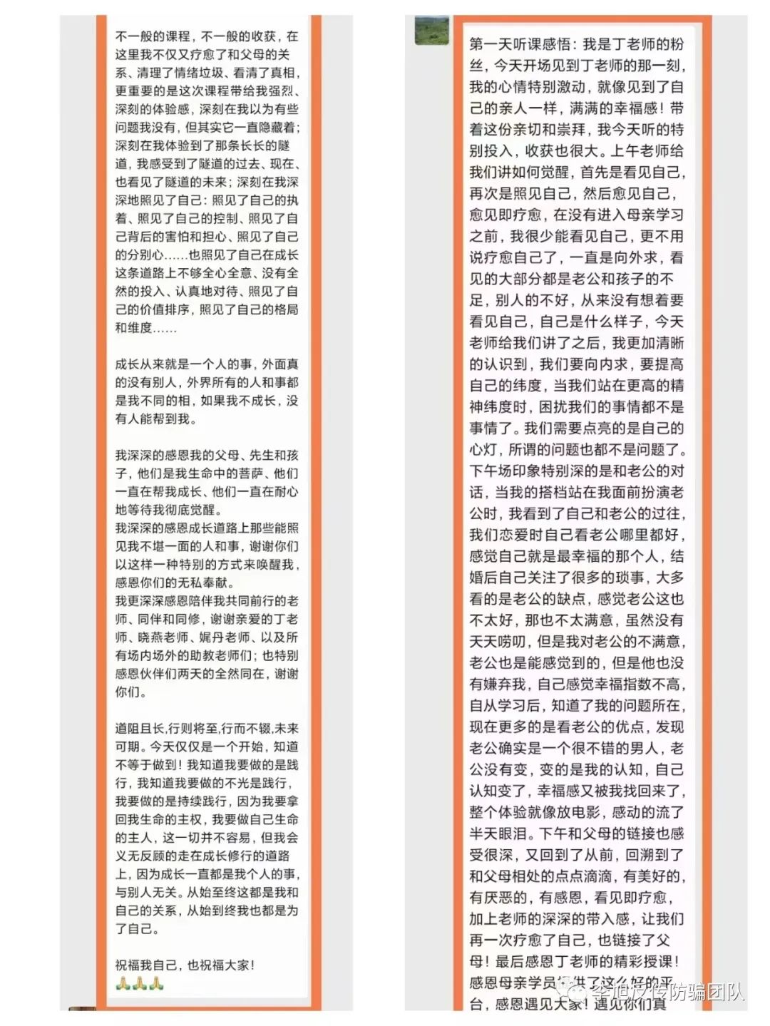 此外,郝女士还发现“母亲学院”经常借着“爱”的名义去幼儿园宣传,并举办沙龙活动。在课程上发表个人经历的学员几乎都是“合作伙伴”本身。每节课结束后,“合作伙伴”会邀请学员在群里发表长篇课后感想,目的是让听课的学员继续购买课程或交钱成为新的“合作伙伴”,以获取高额收益。