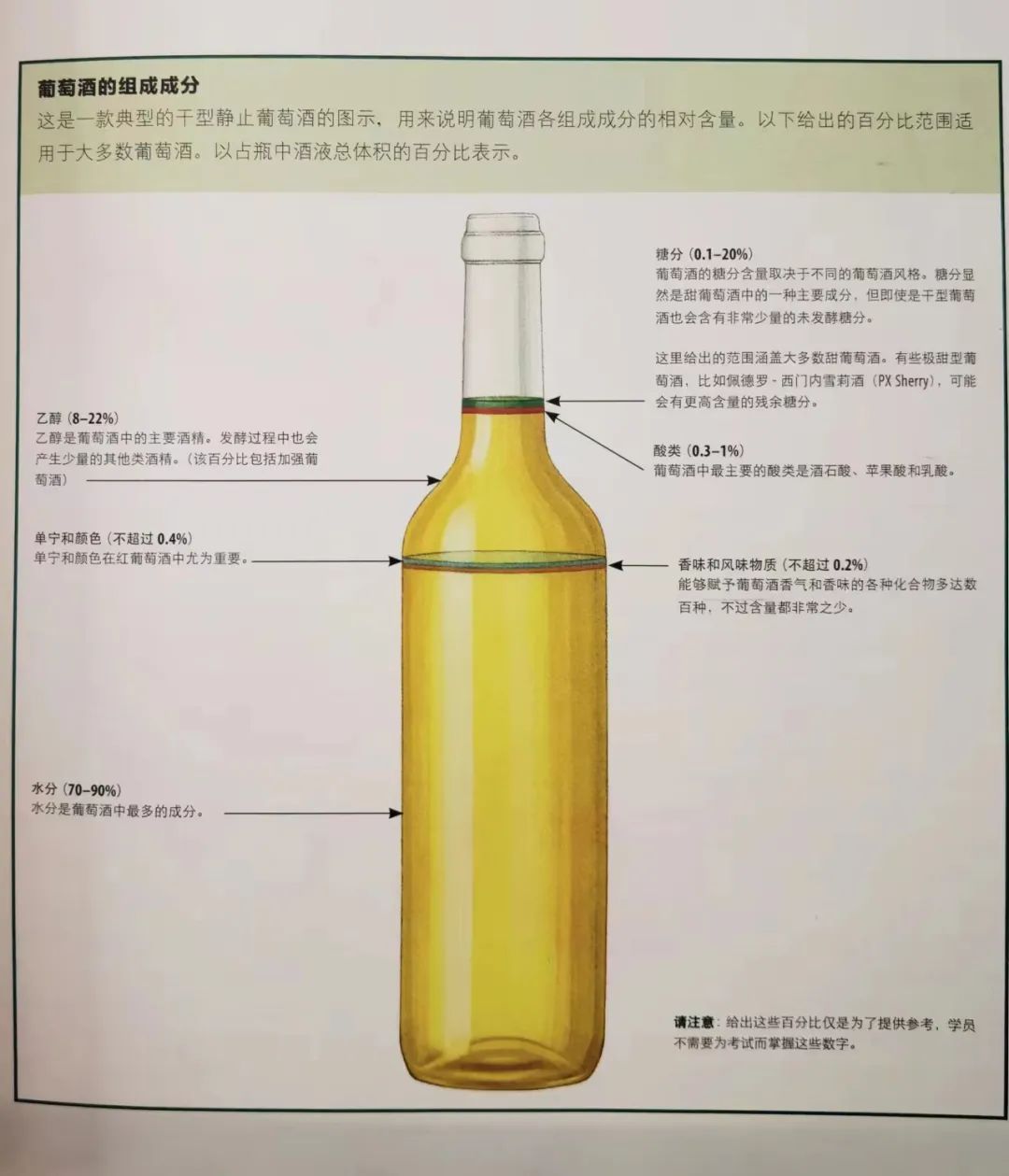 最近有同学问到关于一支干型葡萄酒的组成,翻出书本来说明葡萄酒各组成成分的相对含量。以下给出的百分比范围适用于大多数葡萄酒。以占瓶中酒液总体积的百分比表示。