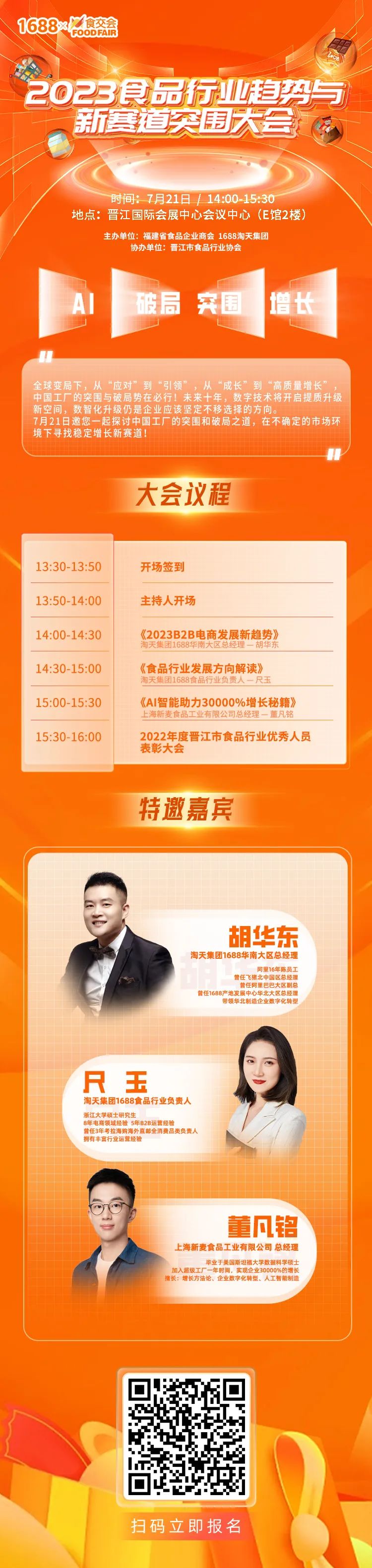 近年来,随着消费者对方便、快捷、高效的需求增加,食品电商行业得到了快速发展。截至2023年,中国食品电商行业市场规模已经超过5000亿元,预计未来几年仍将保持高速增长。未来,随着消费者对健康、安全、品质等方面要求的提高,食品电商行业将面临更大的机遇和挑战。为促进食品企业在品牌数字化营销中稳步向上,为福建省食品行业经济复苏提供源动力,福建省食品企业商会、晋江食品行业协会将联合淘天集团1688举办「“华南造 赢天下”2023年食品行业趋势与新赛道突围大会」。本次大会将全面触达1688平台相关买卖双方群体,连接供应链上下游,提高交易会市场声量,促进食品行业繁荣发展。