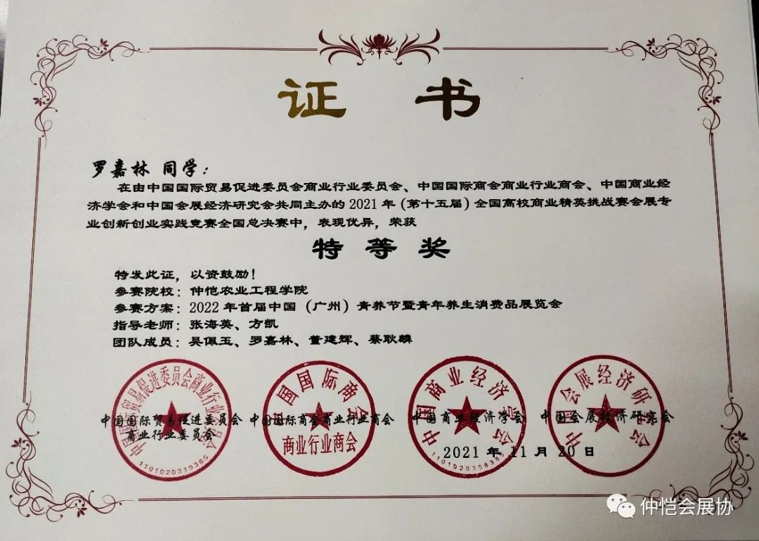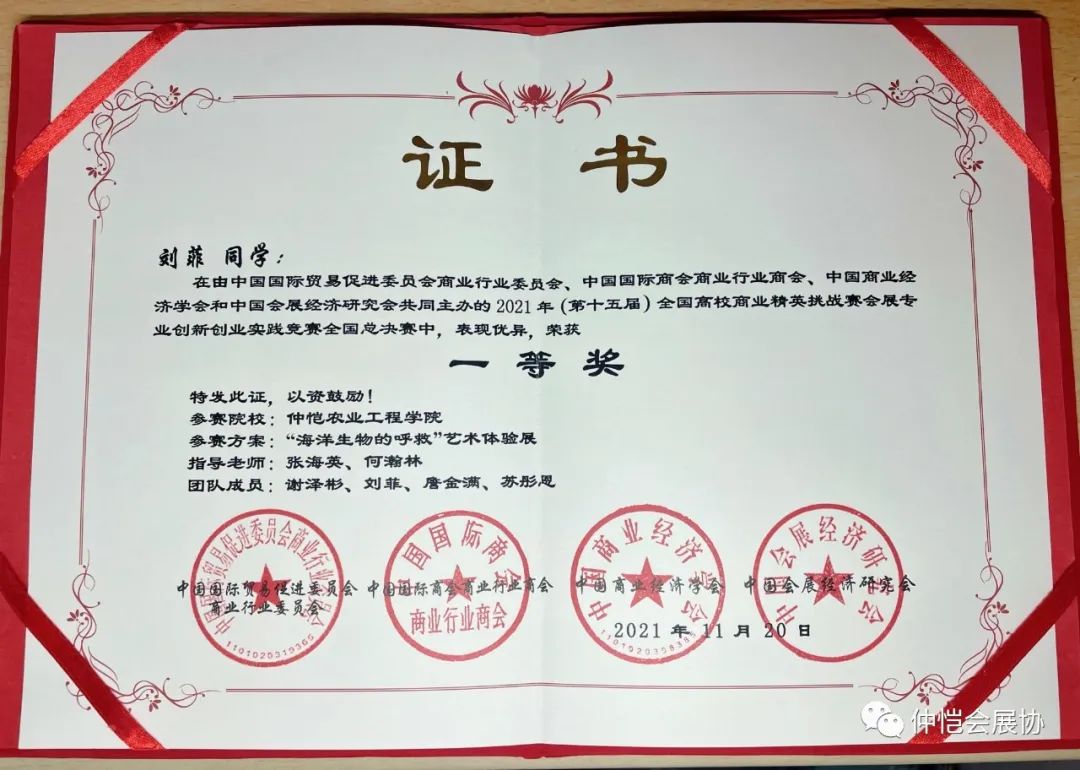 参加初赛的且作品符合要求的参赛者可获得活动加分证明,测评成绩 60 分(含)以上,可自愿申请由中国国际贸易促进委员会商业行业委员会、中国国际商会商业行业商会共同用印的《会展职业经理人》专业证书。该证书目前在企业中认知度较高,目前已被业界广为认可。证书有效性可向中国国际贸易促进委员会商业行业委员会或在网站(www.ccpitcsc.org) 查询。具体申请办法另行通知。