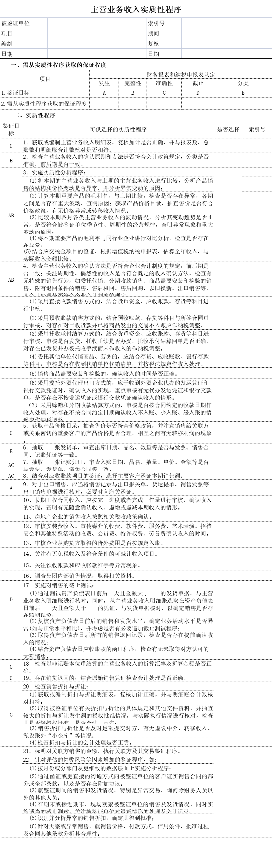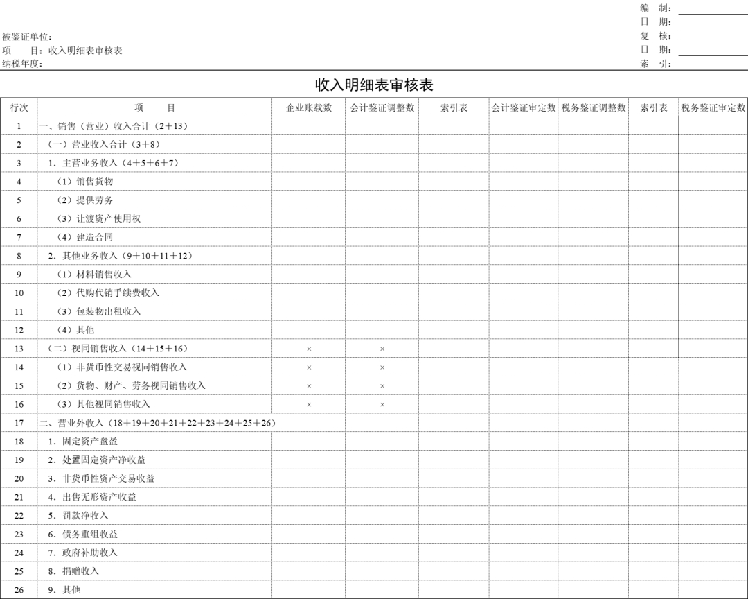 本套资料包括企业:会计核算类底稿(负债类、权益类、损益类、资产类)、纳税调整类底稿(企业所得税纳税调整审核底稿、特别纳税调整审核工作底稿、总分机构所得税审定工作底稿)、统一报告格式、综合类底稿(初步业务活动底稿、风险评估工作底稿、其他项目工作底稿、业务完成阶段工作底稿)