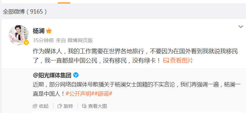 对于移民传闻,今年5月杨澜在个人微博中回应称,作为媒体人,我的工作需要在世界各地旅行,不要因为在国外看到我就说我移民了,我一直都是中国公民,没有移民,没有绿卡!