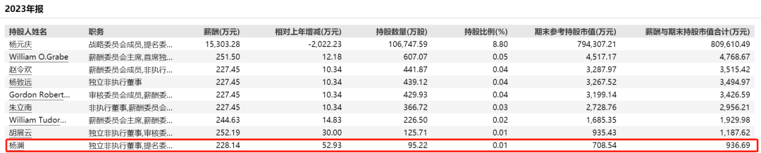 此外,杨澜还是联想集团(00992.HK)的独立非执行董事、提名委员会成员,年薪达228.14万元,在公司高管中排名第五。并且她还持有联想集团95.22万股股份,根据联想集团7月3日收盘股价8.35港元计算,杨澜持有的股份市值约为795万港元(约合人民币735万元)。