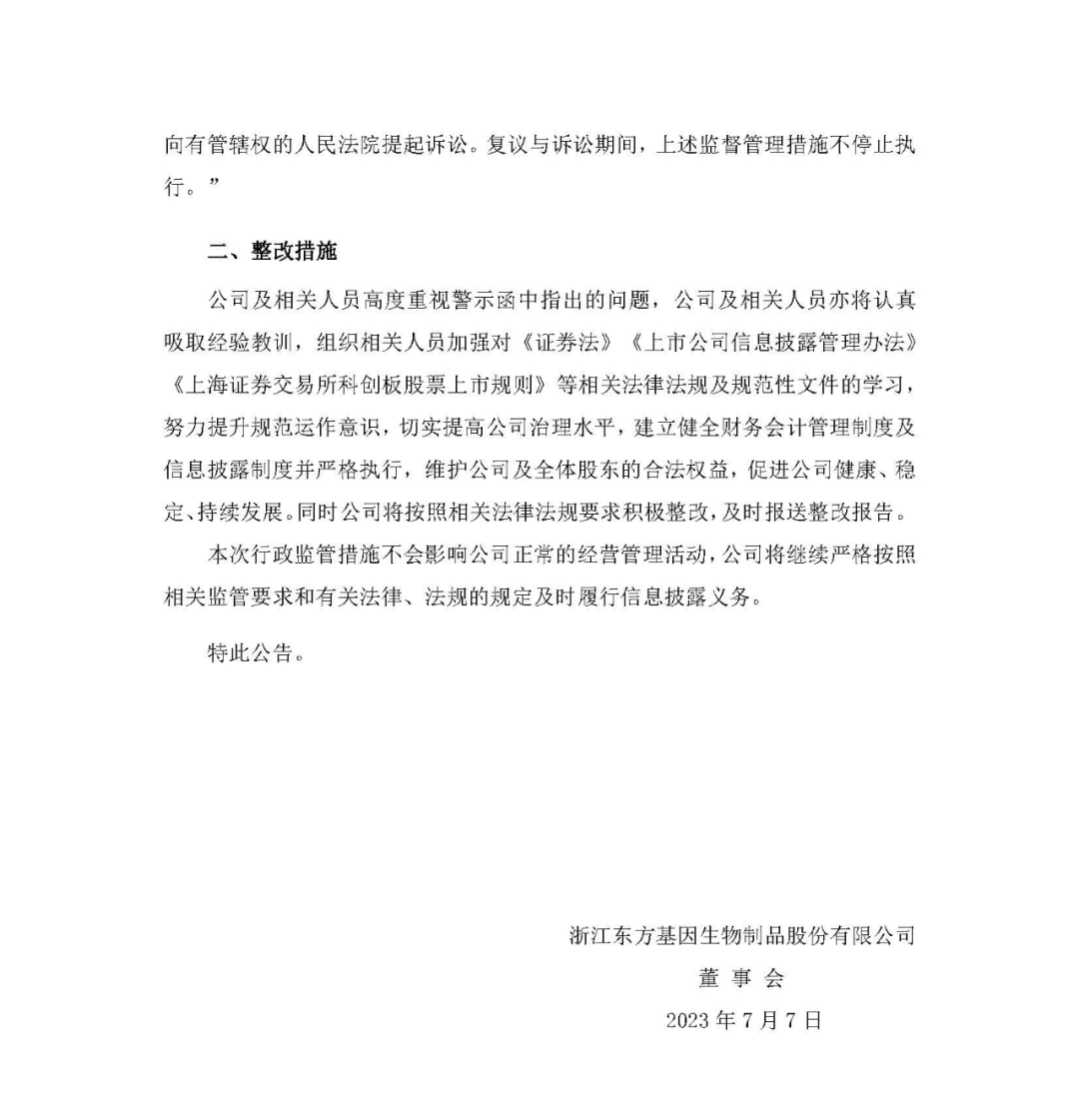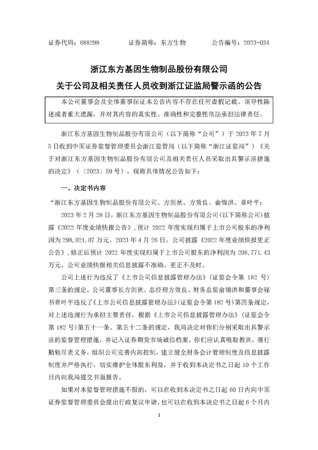 东方生物7月6日公告,公司于7月5日收到浙江证监局关于对公司及相关责任人员采取出具警示函措施的决定。