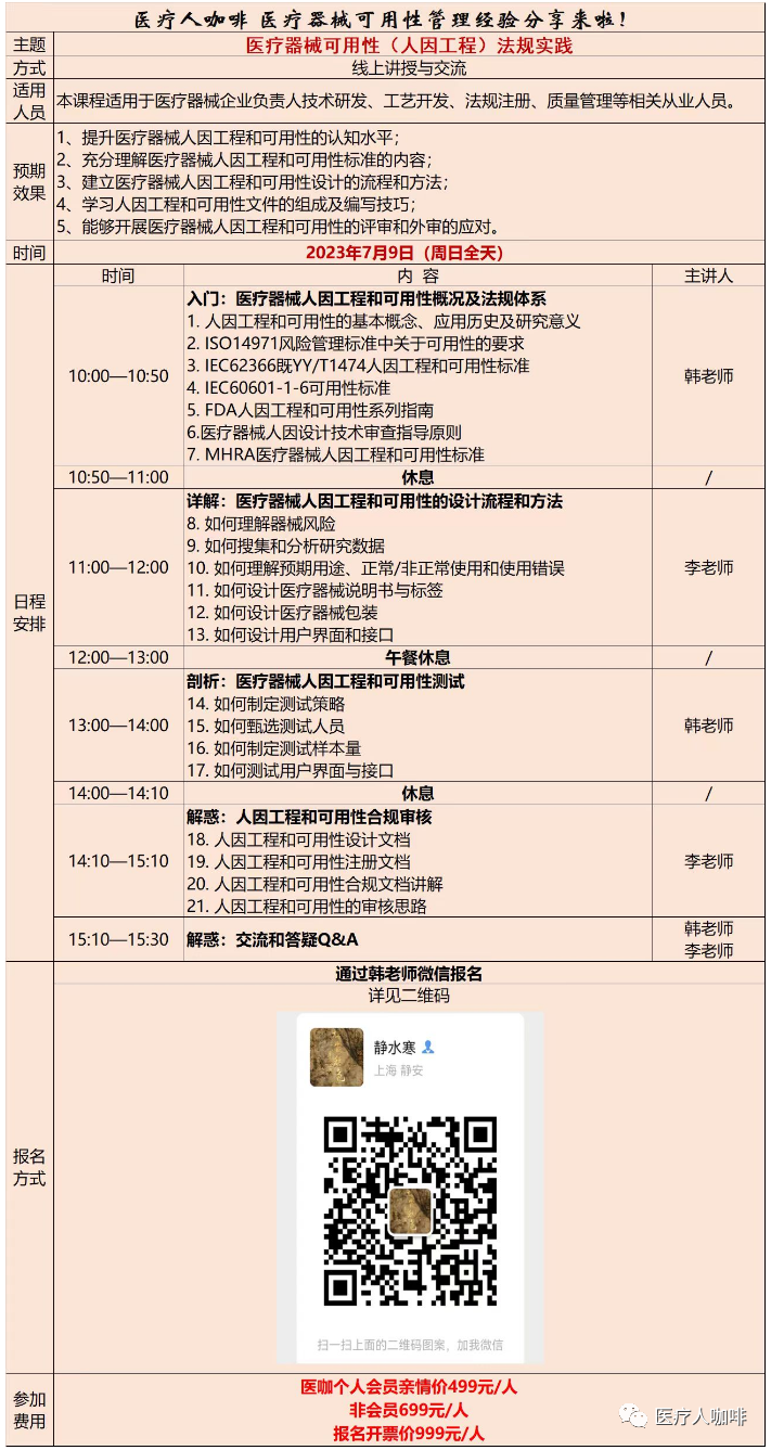7月9日本周日,医咖创始人刀哥和韩老师将为大家举办第50期在线学习沙龙。本次我们将通过腾讯会议直播分享基于IEC62366标准的医疗器械人因工程和可用性法规,欢迎朋友们参加!