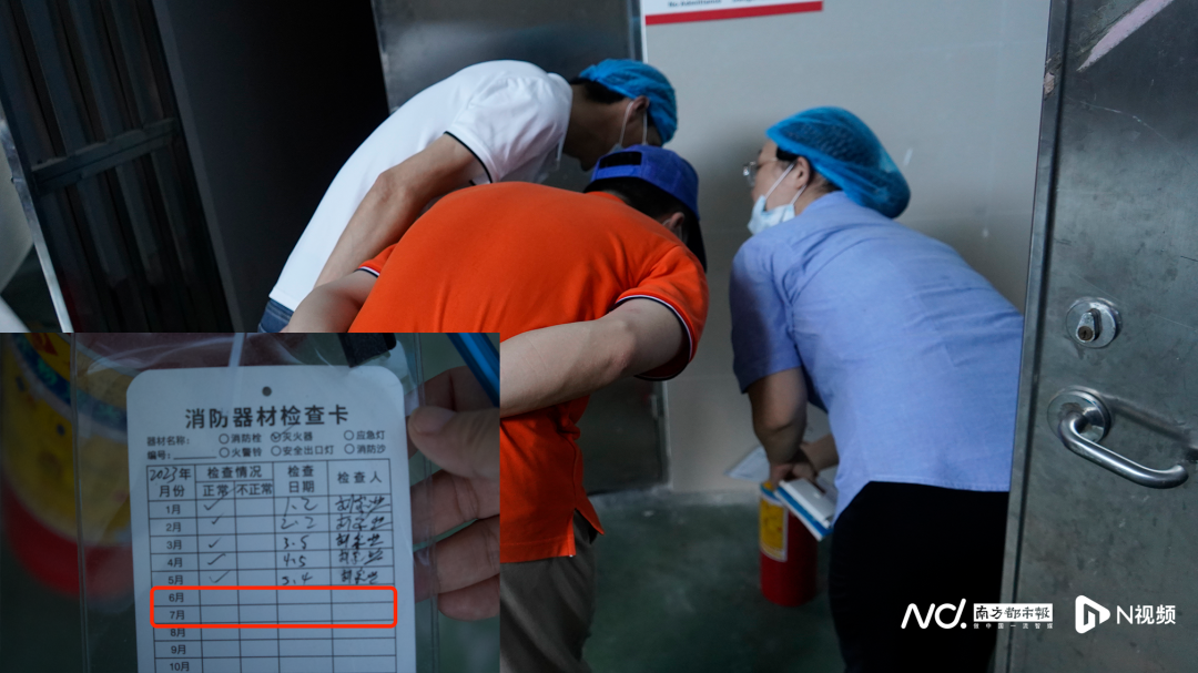 检查组专家指出,消防器材检查卡上记录到上一次巡查是5月4日,说明已有两个月没有对消防器材进行巡检。