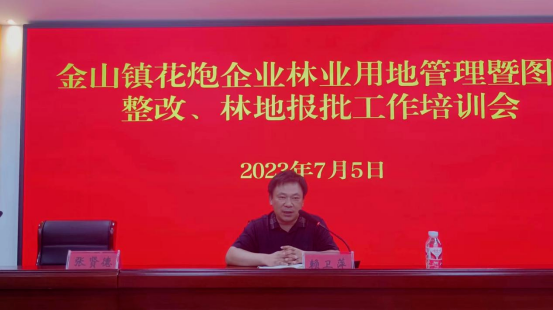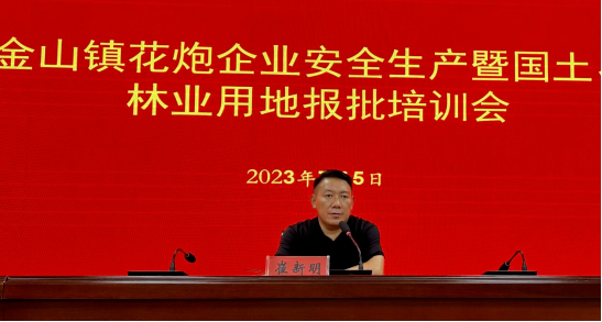 7月5日,金山镇在南华村多功能会议室召开花炮企业安全生产暨国土、林业用地报批培训会,会议邀请县自然资源和规划局执法监察大队大队长彭武、县林业发展服务中心副主任赖卫萍现场授课,镇党委委员、常务副镇长文礼庚,镇花炮分管领导崔新明,镇党委委员、组织委员李花,副镇长张贤德,镇行政审批中心主任赵海君以及全镇烟花爆竹企业主要负责人、安全厂长、花炮办全体成员共计140余人参加会议。 彭武从烟花爆竹简介、发展历程及用地手续、《土地管理法》解读、问题分析和工作建议五个方面内容作了培训。