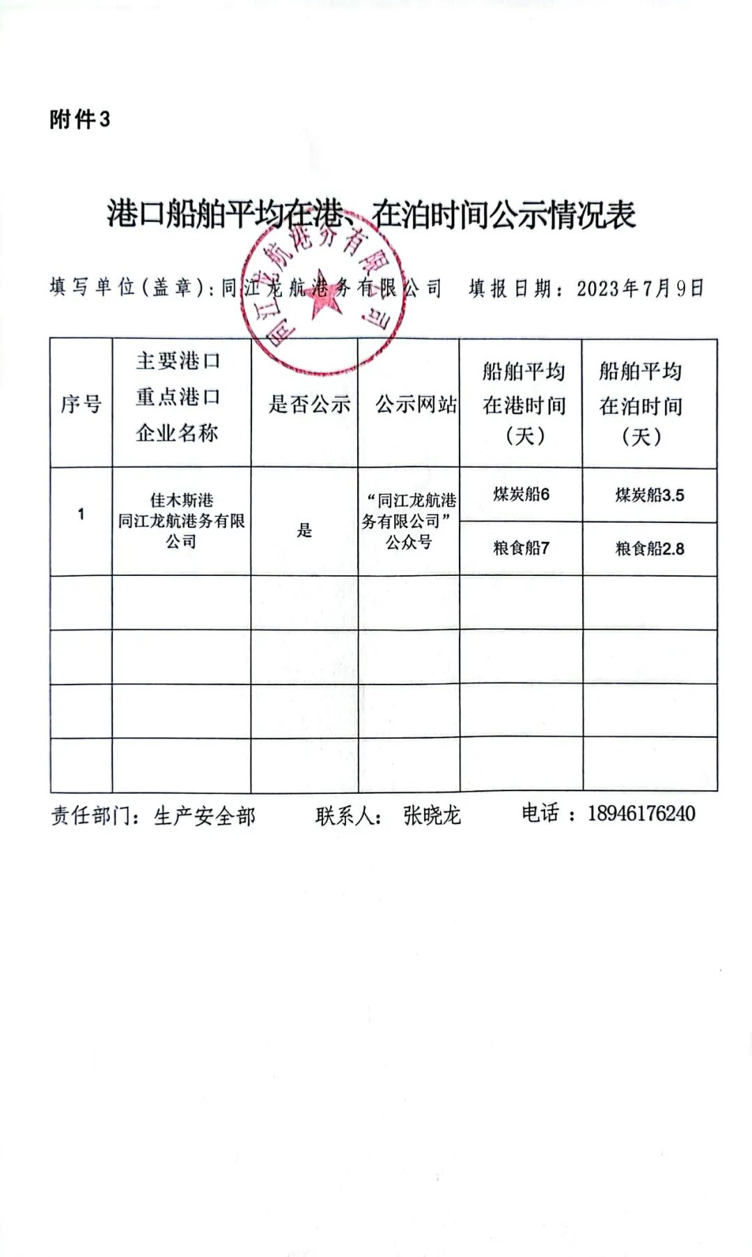 为提升黑龙江省港口综合服务能力,我公司按照《交通运输部办公厅关于做好港口服务能力提升工程有关工作的通知》和黑龙江省航务事业发展中心港口事务处有关要求,现将港口船舶平均在港、在泊时间进行公示。