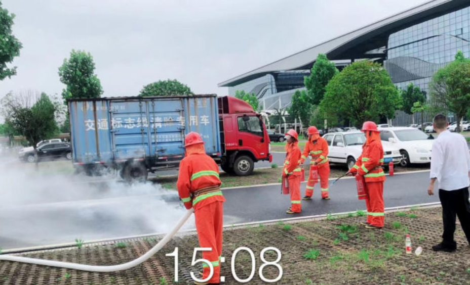 消防理论知识培训结束后开展了实操演练,参训人员分组对二氧化碳灭火器进行实操演练,在操练中切实掌握了灭火器的正确使用方法;协作完成了消防水带抛接演练,强化了物业服务团队的火灾应急处置能力。