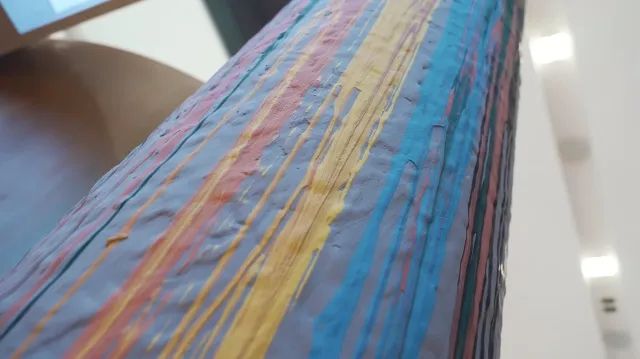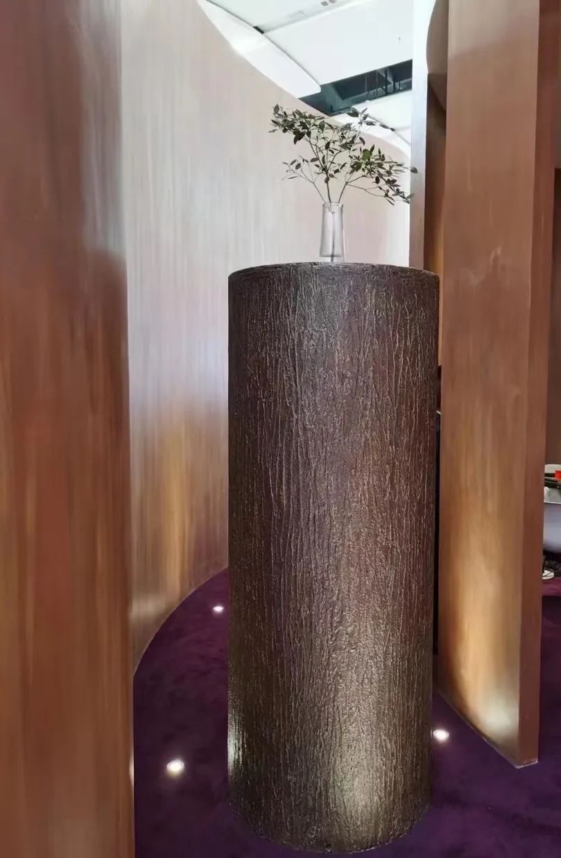 当我们走到恰似“Y”字型岔路口时,屹立的长柱与我们神秘相遇,这根长柱肌理感超强,他斑驳的纹路在自然线条里交相辉映,复古的审美,外显的奔放,以不饱和的色调,缔造出有韵味、唯美的高级空间,其内敛和美丽尽显奥可之美。