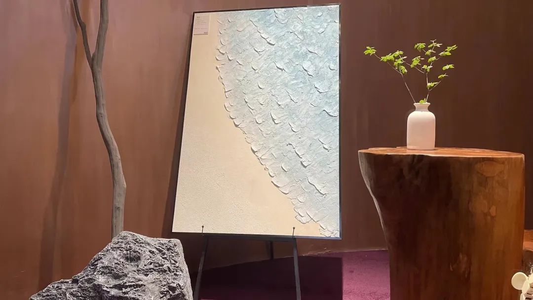 一眼望去,犹如走在时代的长廊上,当我们处于不同的位置,观感也不同。整个画面聚焦,面与色的浪漫,墙面悬挂的意大利奥可产品六块样板,每一款都有自己独特的“气质”,一向排列的是SETAMUR、MARMORINO、GRASSELLO、VELLUEL、CLASS、STYLE,角落的树枝使整个画面感增添了活力,同时也增添了意境感。