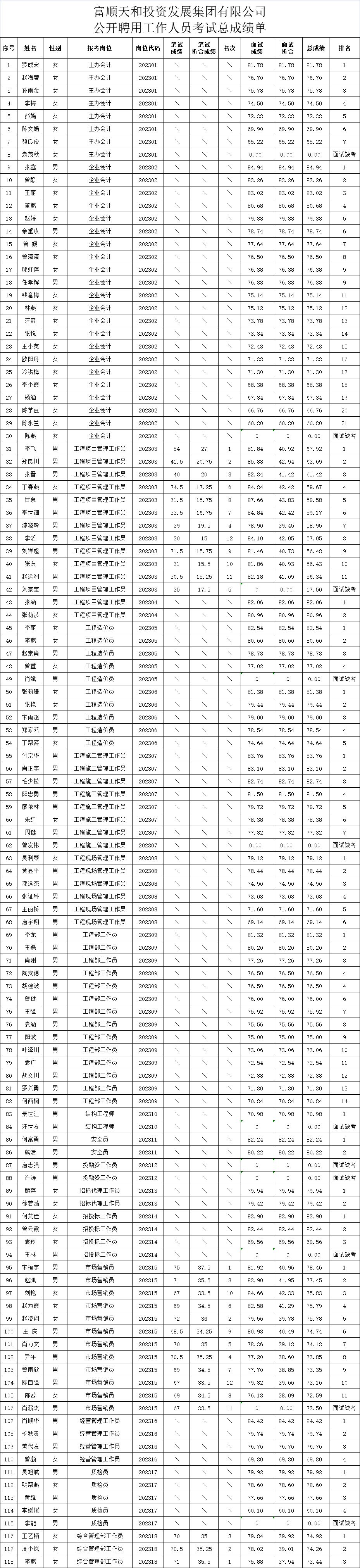 附件:富顺天和投资发展集团有限公司公开聘用工作人员考试总成绩单