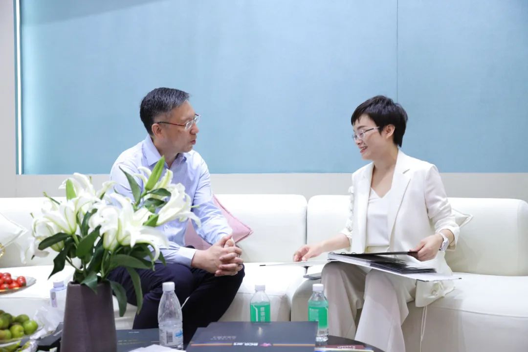 紫荆花新材料集团联席总裁冯秉光(左)与“软装一姐”蓝筱玉在展馆中交流