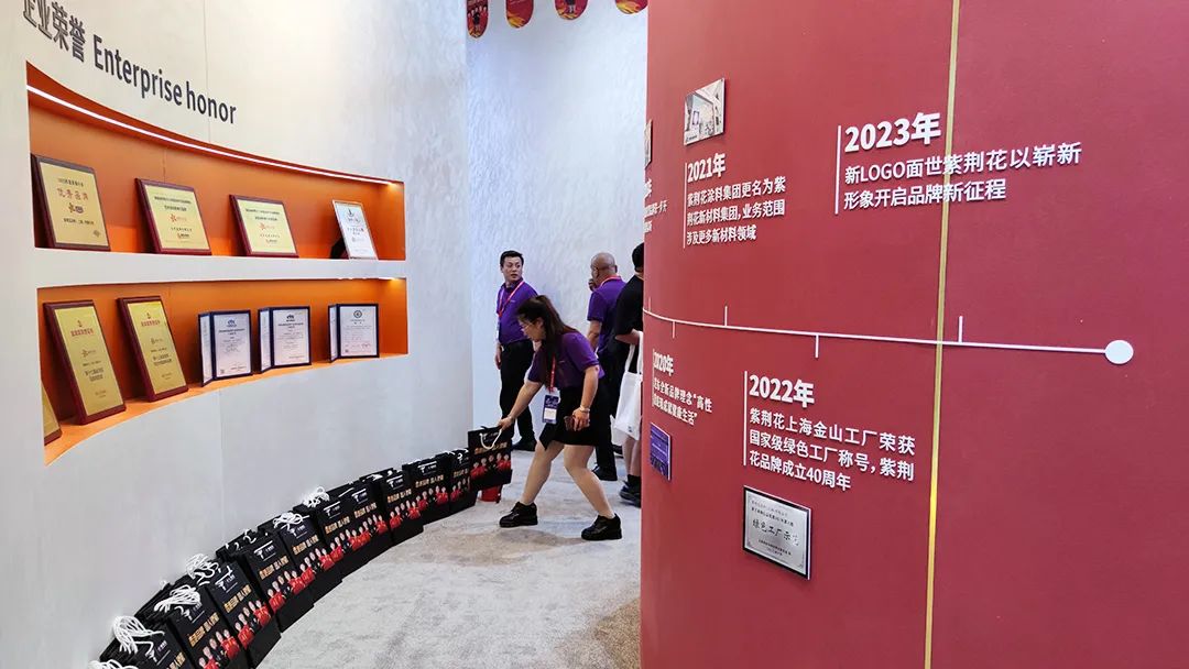 当然,紫荆花的展会发力并不止这些,“镶嵌”于展示墙上的高端产品包装同样诉说着品牌的雄厚实力。尤其是因应品牌发展40周年而推出的“1”“9”“8”“2”系列艺术涂料产品,跟品牌的故事完美结合,永不过时。紫色半圆形墙面上的历史印记,以及与之相对的荣誉展示,同样很好地阐释了这个自带高端属性的涂料品牌底蕴和实力。