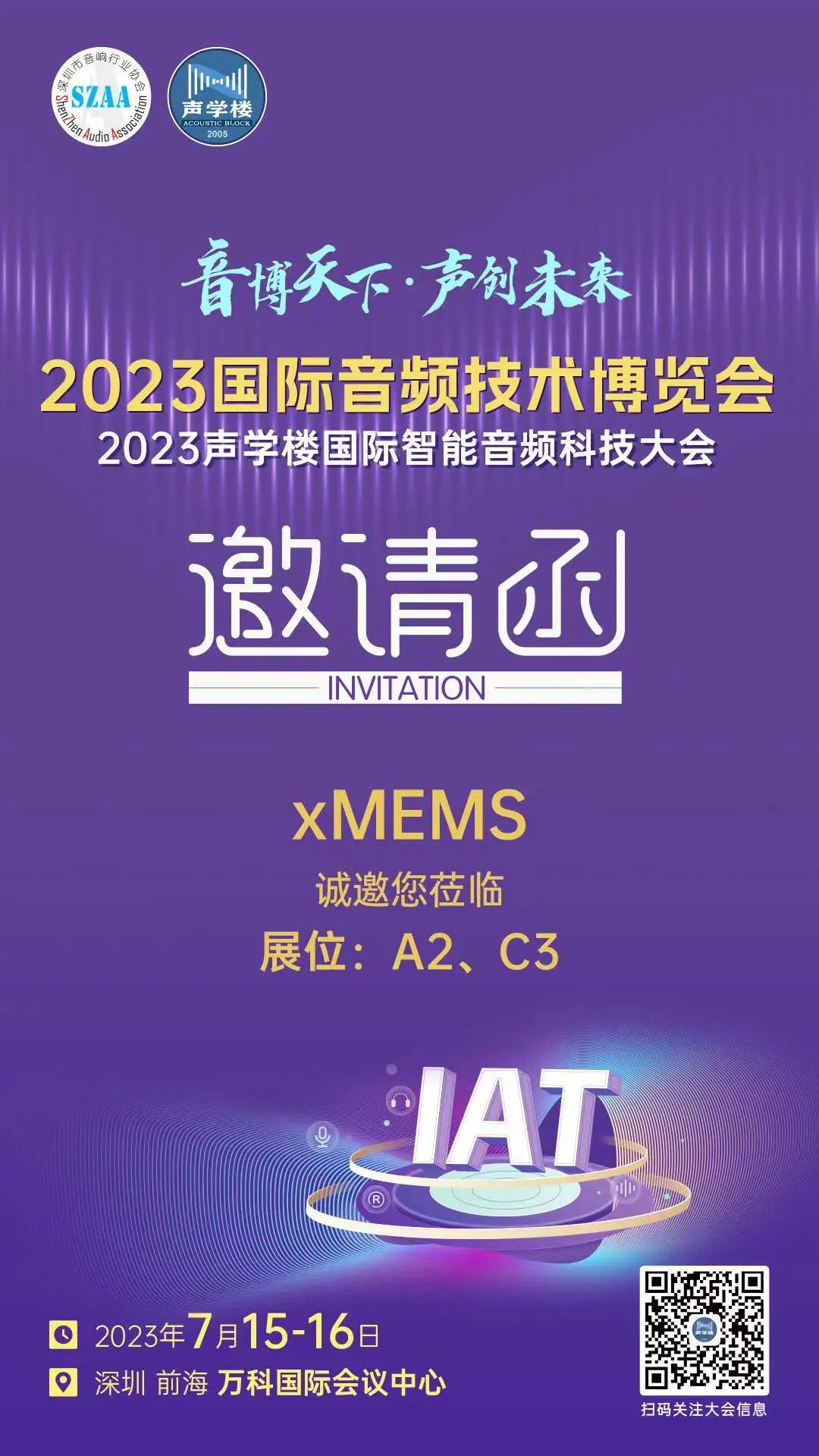 xMEMS将参加在深圳举行的2023国际音频技术博览会(IAT2023)! 欢迎大家与xMEMS的市场部全球副总裁Mike Housholder先生一起探索音频的未来,他将在会议上介绍:“声音重塑-全球首款全硅固态MEMS扬声器”。 欢迎参观xMEMS的A2、C3展位,亲身体验固态保真™,相信引人入胜的现场演示一定会让大家沉浸其中。 准备好迎接更高级别的声音保真度了吗?