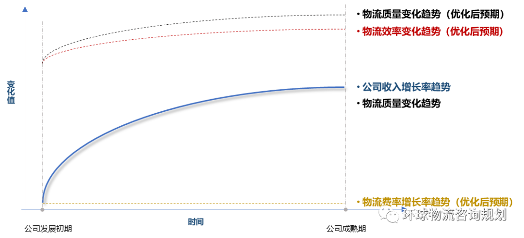 物流成本变化趋势(优化后理想状态下):假设公司物流运作在公司营收增加的过程中进行了合理管控,物流费率在物流运作的复杂度增加后依然可控;
