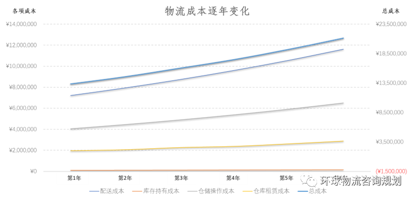 比如我们首先将配送成本、库存持有成本、仓储操作成本、仓库建设或租赁成本以及总成本进行测算(计算的过程可以参考我们分析模型以及之前所介绍的物流成本计算方法)。